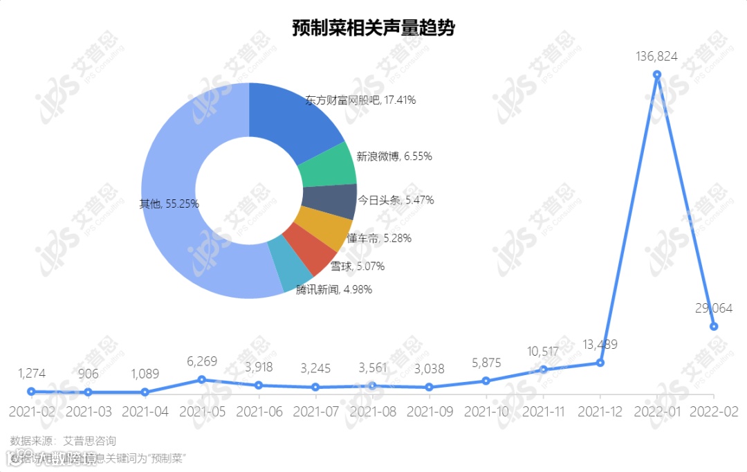 据艾普思自建搜索引擎数据,2021年2月1日至2022年2月20日,预制菜相关声量达21.91万余条,其中东方财富网股吧和雪球等投资类信息平台的信息量占比较高,分别为17.41%、5.07%。全部信息中,与预制菜股市相关的占比35.22%;舆情热词中,“涨停”、“风口”被提及次数分别为41,794次、12,683次,可见预制菜股市频繁波动,各路资本入局助推预制菜行业迅速发展。