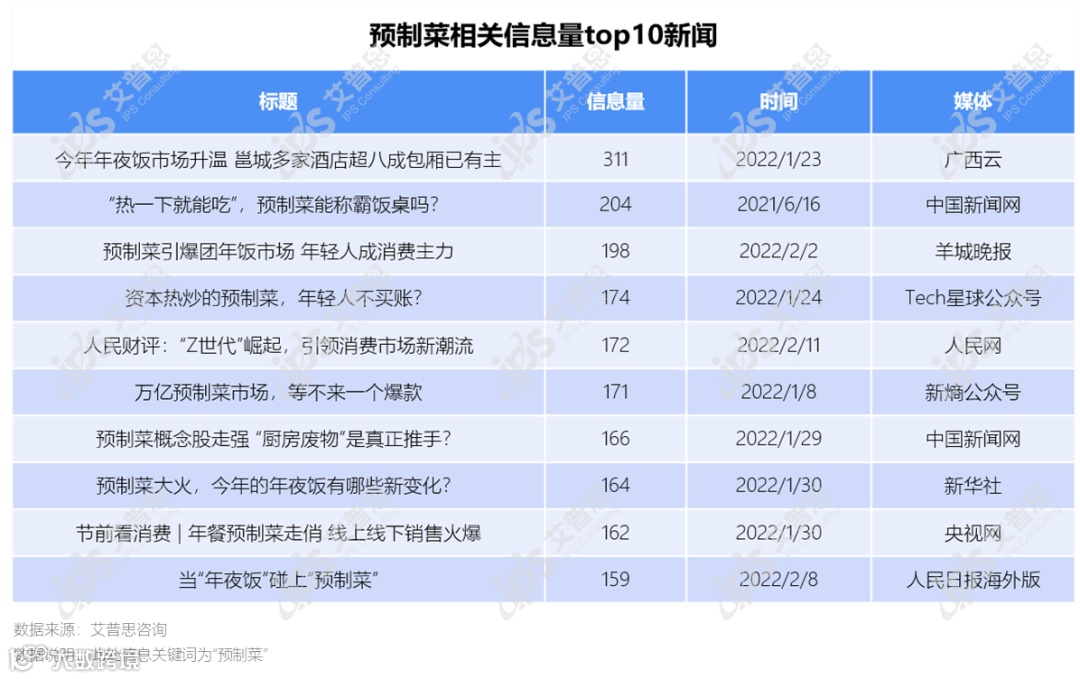 从声量趋势来看,2022年1月预制菜信息量最高,达13.68万余条;1月正值春节即将来临之际,不少远在异乡厨艺不佳的年轻人瞄准了预制菜,数据显示,舆情热词中,“年夜饭”和“年轻人”的出现频率分别为5.48万次、1.38万次;预制菜声量top10信息标题中,“年夜饭”和“年轻人”也被多次提及;据羊城晚报报道,预制菜引爆团年饭市场,年轻人成消费主力。