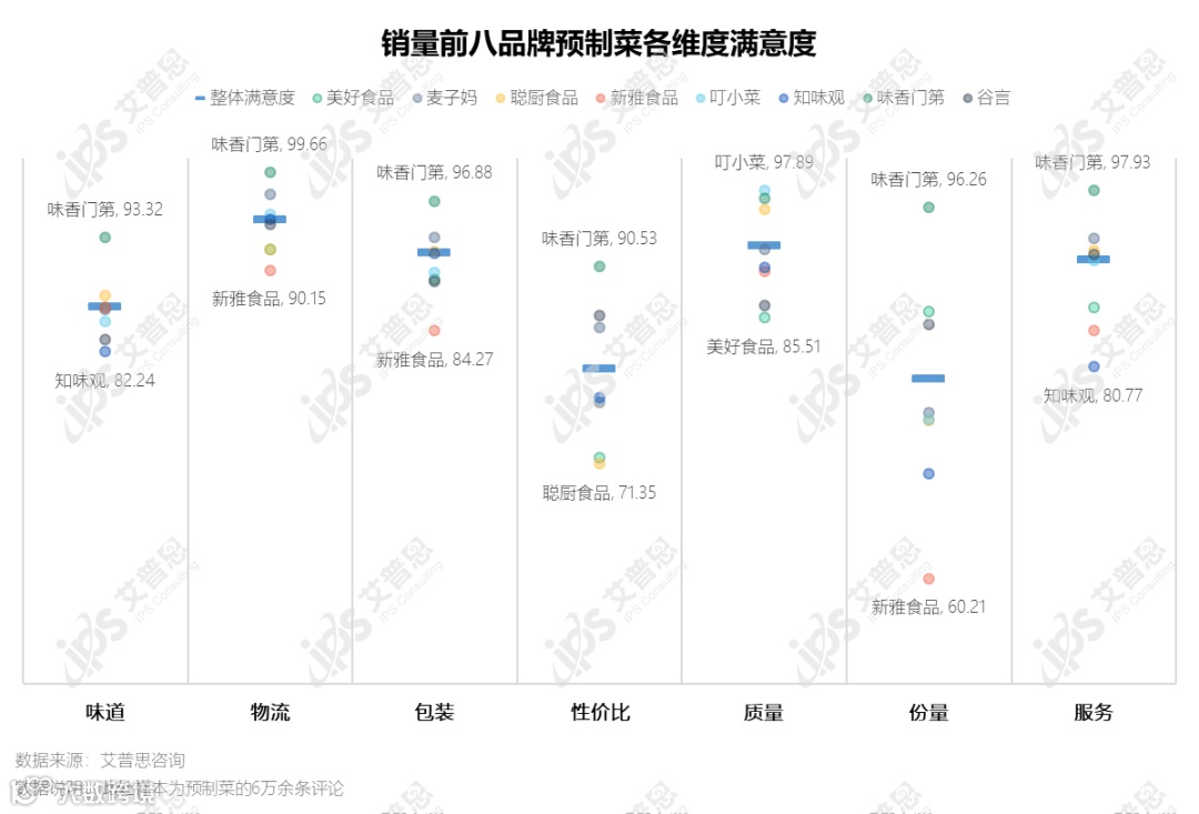 对比销量前八品牌各关注维度的满意度发现,新雅食品在物流、包装和份量方面满意度最低,消费者主要描述其“冰块融化、包装破损、菜量少”等;知味观在味道和服务方面的满意度最低,消费者主要描述其“鱼有腥味、味道偏咸、客服态度差、回复慢”等。