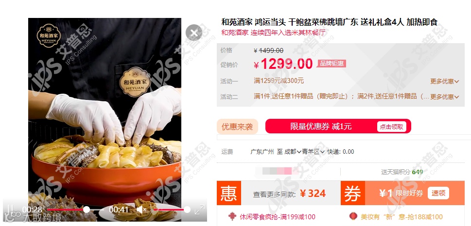 广州的预制菜均价最高,为433.36元/件,销量排行靠前的菜品是和苑酒家的佛跳墙(1299元/件)和花胶鸡礼盒(499元/件),分别占比28.52%、17.81%;日照预制菜销量主要集中在味香门第的佛跳墙(占比99.96%),该产品单价为49.9元/250g,份量小,适合单人食用和消费者尝鲜,较有市场潜力。