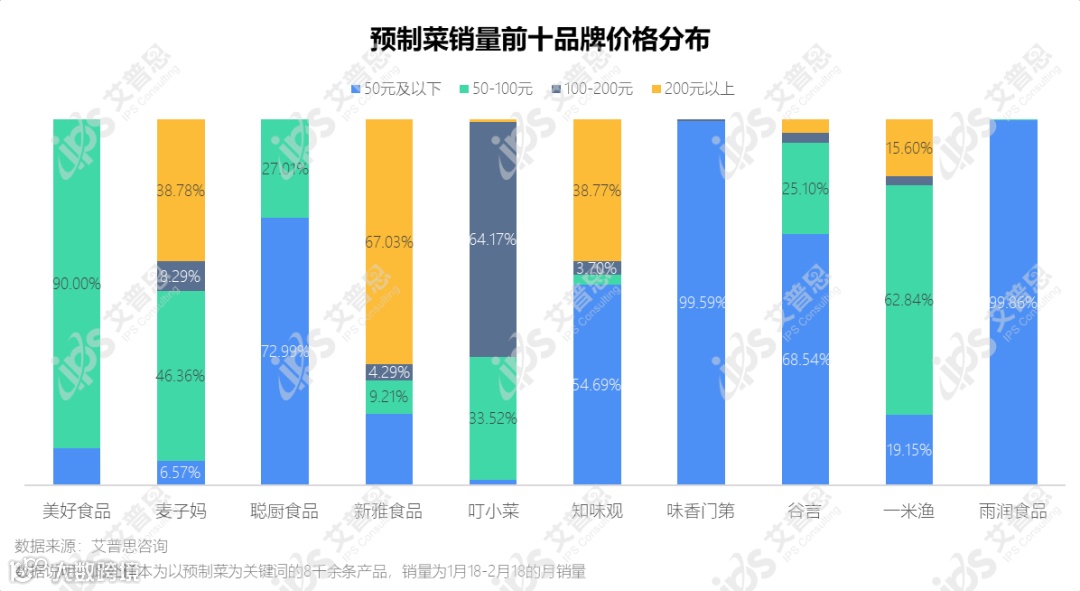 销量前十品牌中,新雅食品(284.83元/件)、麦子妈(222.64元/件)、知味观(175.84元/件)的均价排行前三;美好食品和一米渔50-100元的菜品销量最高,叮小菜100-200元的菜品销量最高(占比64.17%);聪厨食品、味香门第、谷言、雨润食品50元以下的菜品销量最高,占比均超过60%。