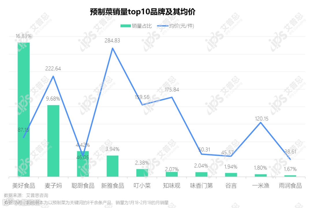 从品牌格局来看,预制菜行业市场集中度低,销量前十品牌合计占比仅46.76%,竞争激烈;销量前三的品牌依次为美好食品(占比16.83%)、麦子妈(占比9.68%)、聪厨食品(占比4.42%)。