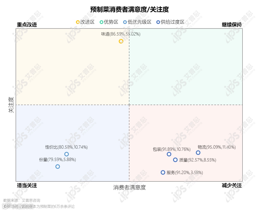 从各关注维度的整体满意度来看,消费者对预制菜物流(95.09%)、质量、包装和服务的满意度均较高,对预制菜的味道(86.59%)、性价比和份量(79.59%)的满意度较低。