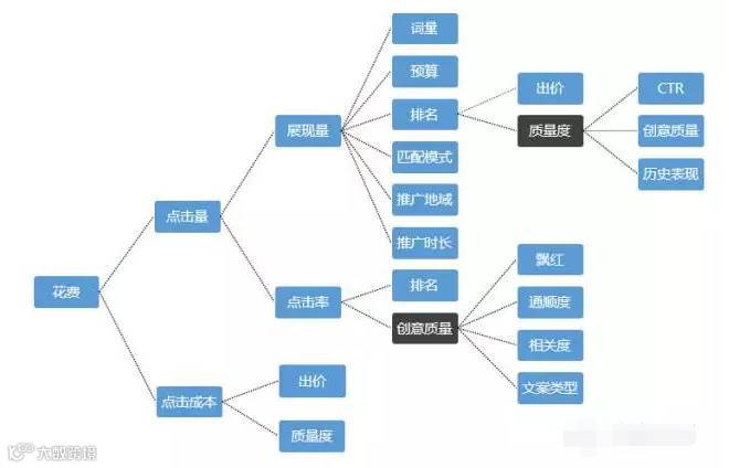 影响搜索推广前端数据表现的因素:根据数据报告找出前端效果不好的原因,再根据以上关系图谱对影响因素进行调整,优化。