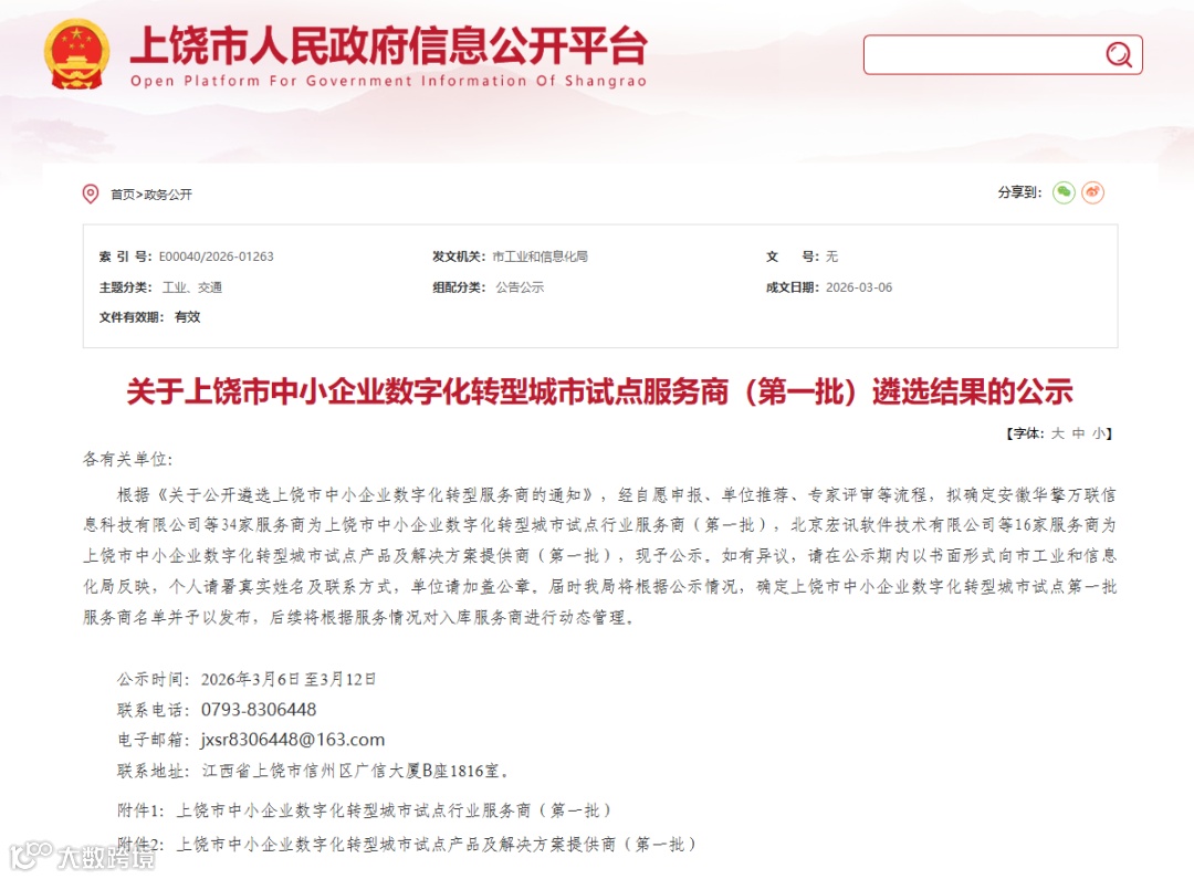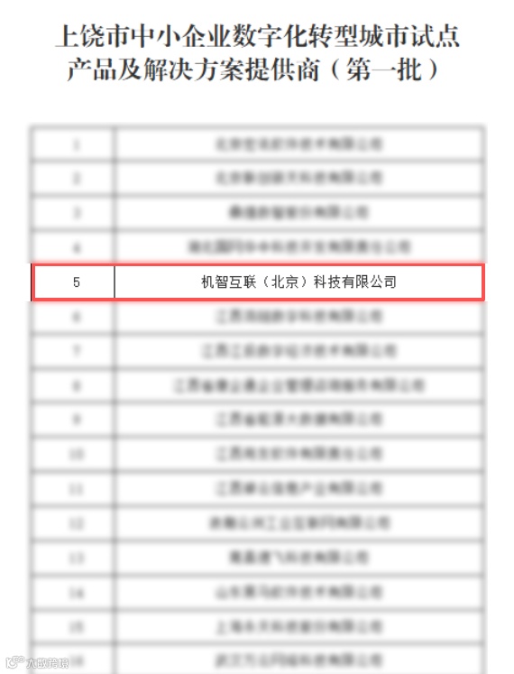 近日,上饶市工业和信息化局正式公布上饶市中小企业数字化转型城市试点服务商(第一批)遴选结果。凭借领先的数字化解决方案、丰富的行业落地经验与专业的服务能力,机智互联(北京)科技有限公司成功入选产品及解决方案提供商名单,成为上饶市数字化转型服务商资源池核心成员,将深度参与上饶市中小企业数字化转型城市试点建设。