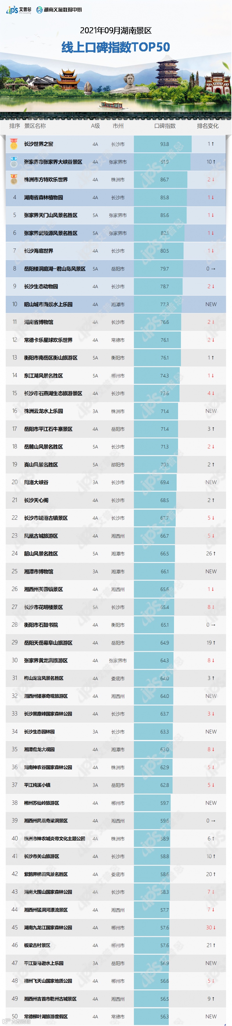 榜单|2021年8月湖南景区线上口碑指数TOP50