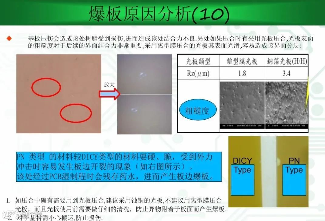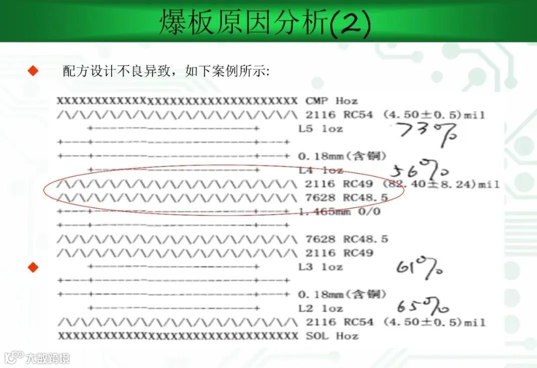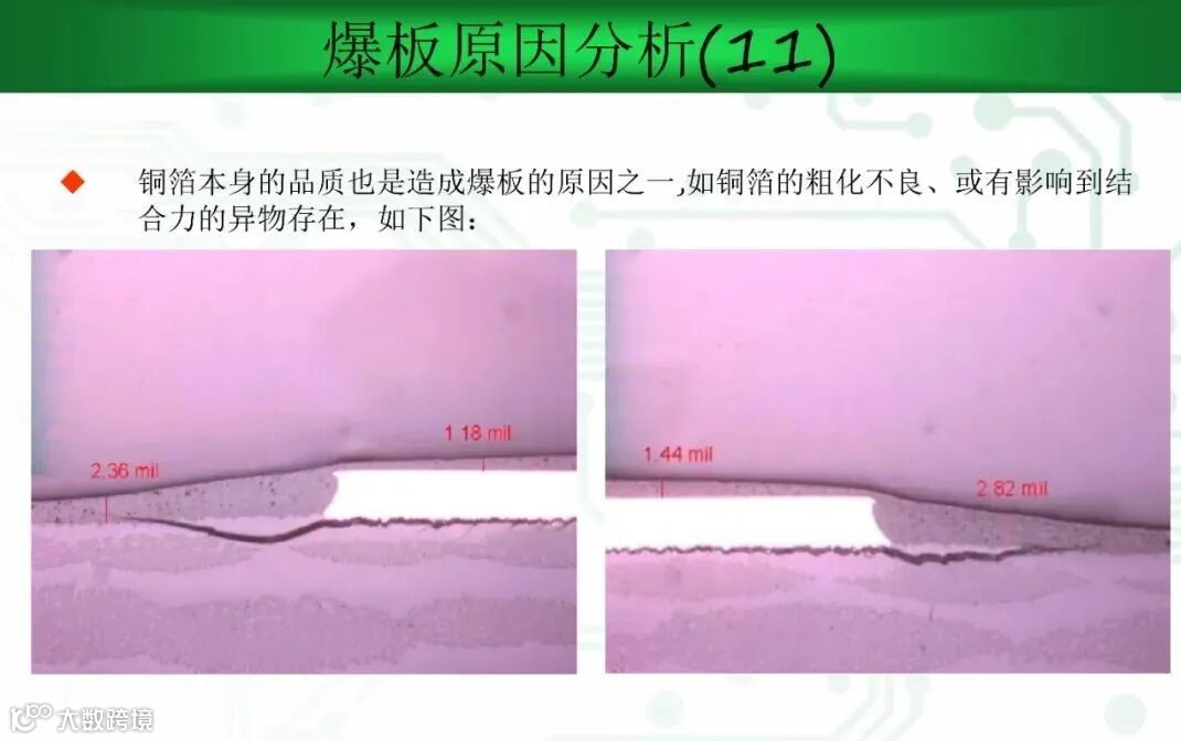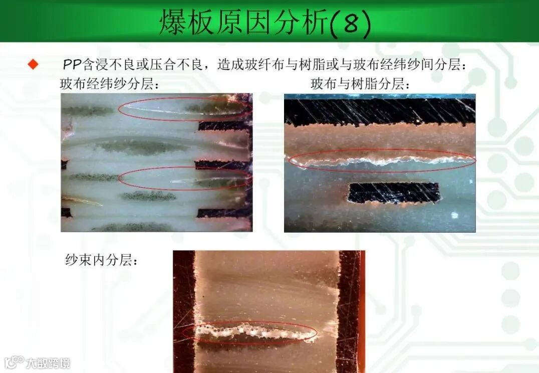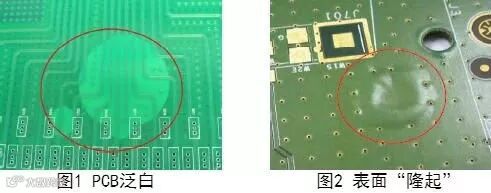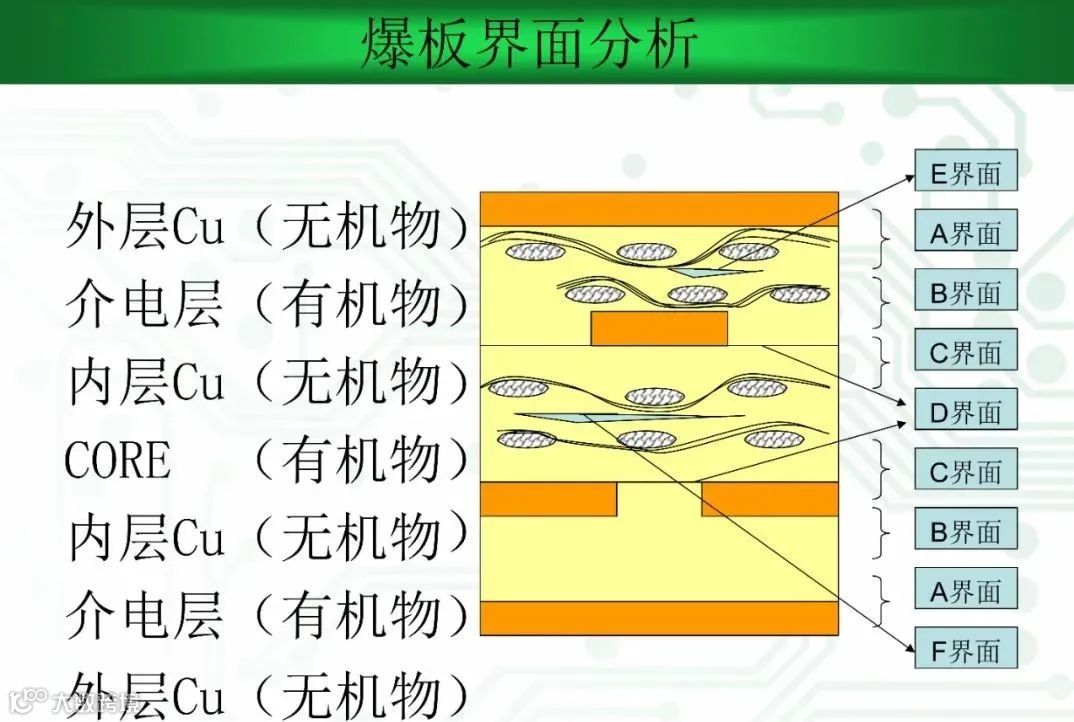 目前业界普遍所说的爆板是指分层和起泡。起泡与分层的区别为,起泡在板表面上看出“隆起”,而分层只在板表面上看出“泛白”,但不出现“隆起”现象。在严重情况下,两种情况会同时存在于同一板上。