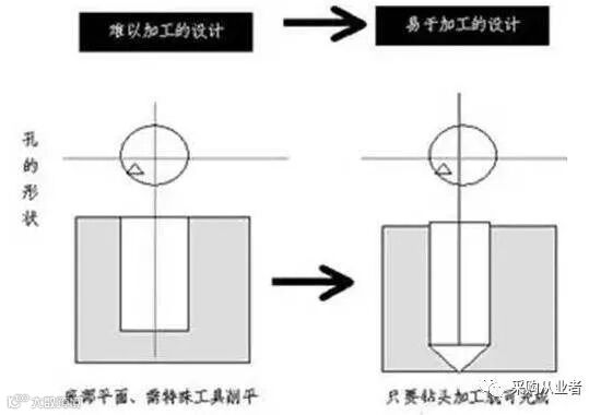 如设计某产品,其底部是一个非常平的孔,产品成本就很高,但把它设计成平的,必须用到特殊的处理方法。如果该产品的底部是平的,就需要用特殊的工具削平,而如果把它的底部设计成三角形,只要使用钻头打孔,而不需要其他特殊处理,如图3所示。