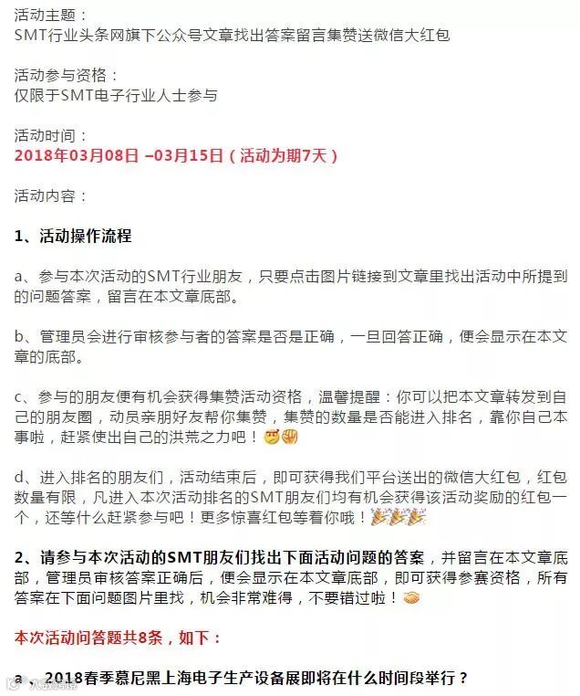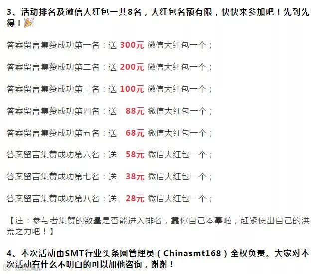 SMT行业头条网隆重推出文章找答案赢惊喜微信大红包活动!快来参加吧!!