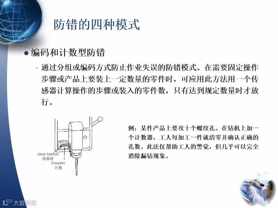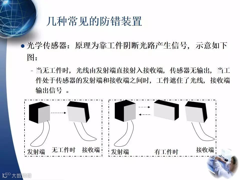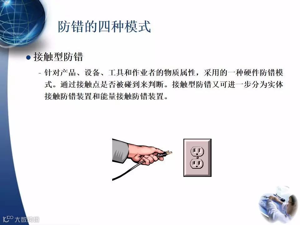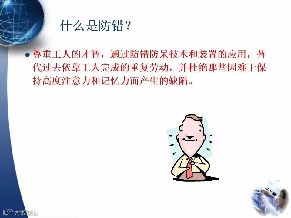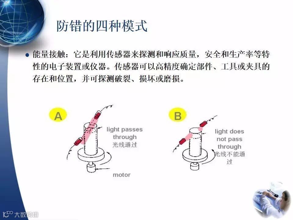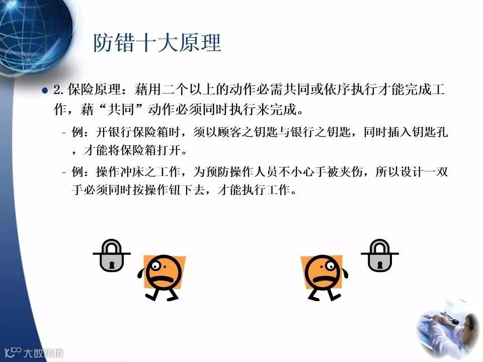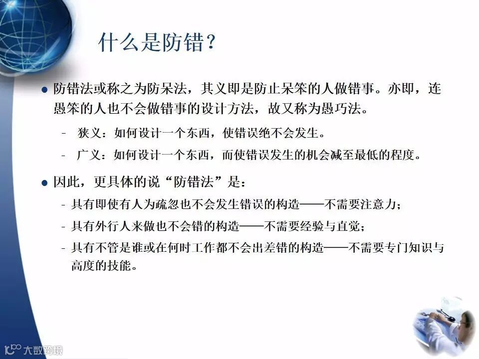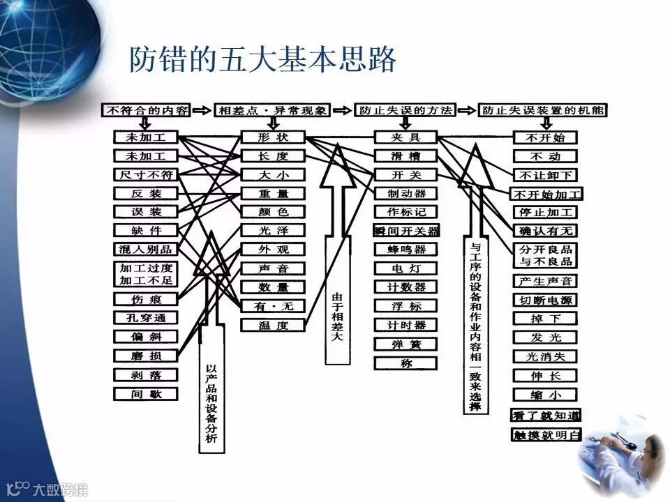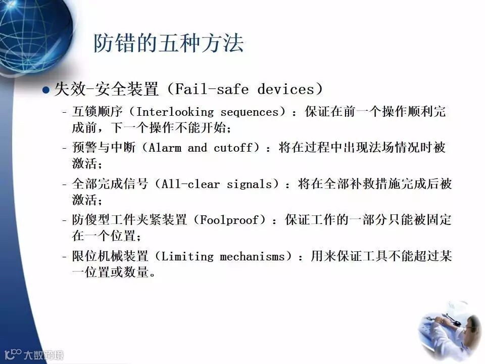 防错原理是通过究源性检查找出产生缺陷的根本原因,设计装置或方法对此差错实现100%检验,避免缺陷再次出现的方法。