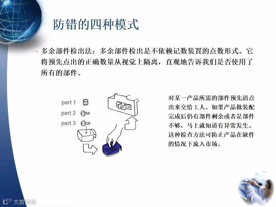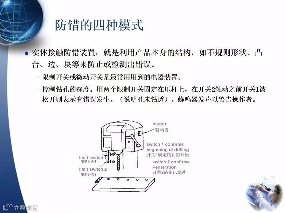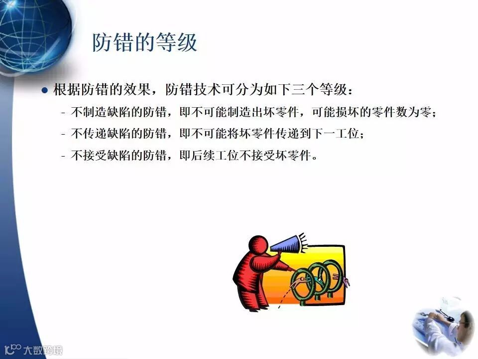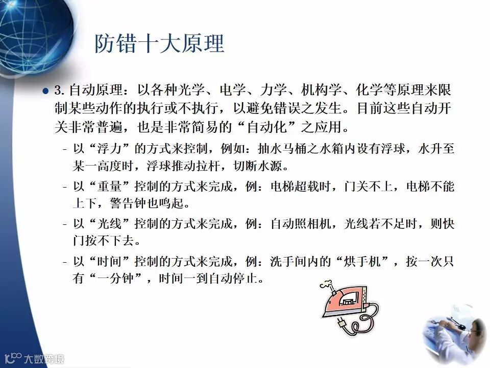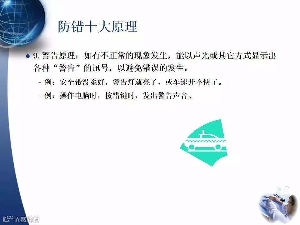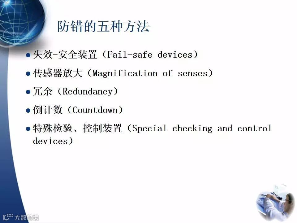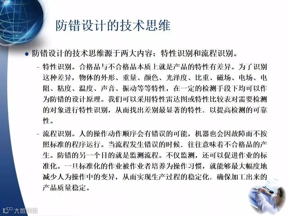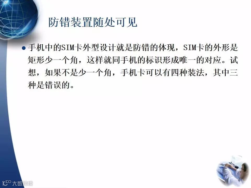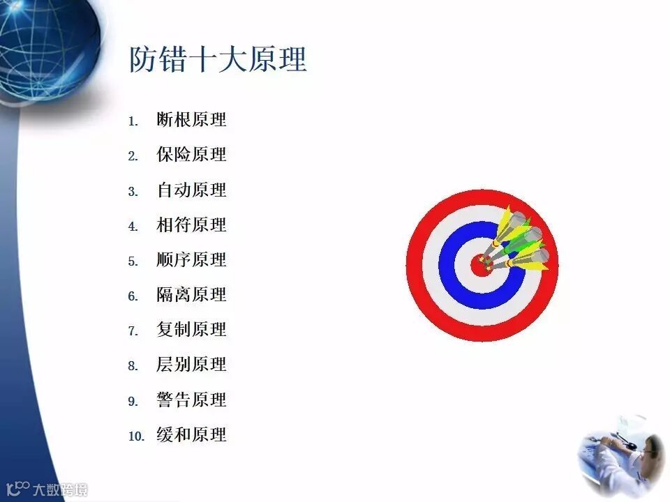防错原理是通过究源性检查找出产生缺陷的根本原因,设计装置或方法对此差错实现100%检验,避免缺陷再次出现的方法。