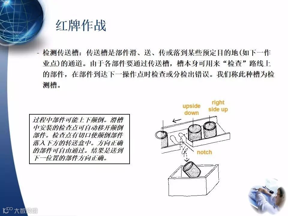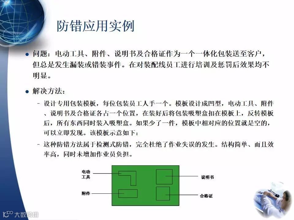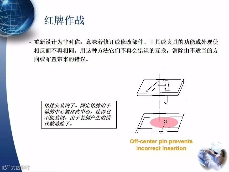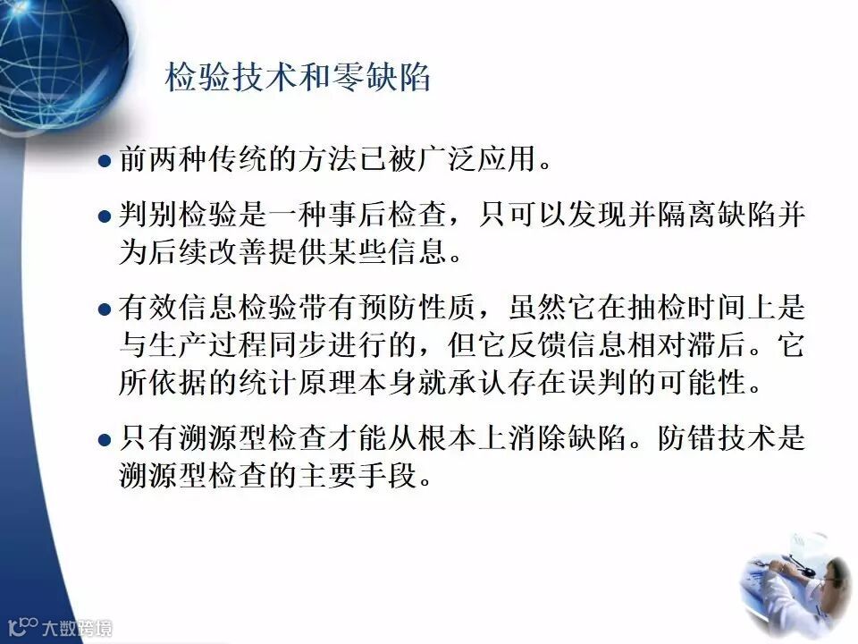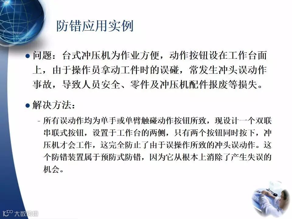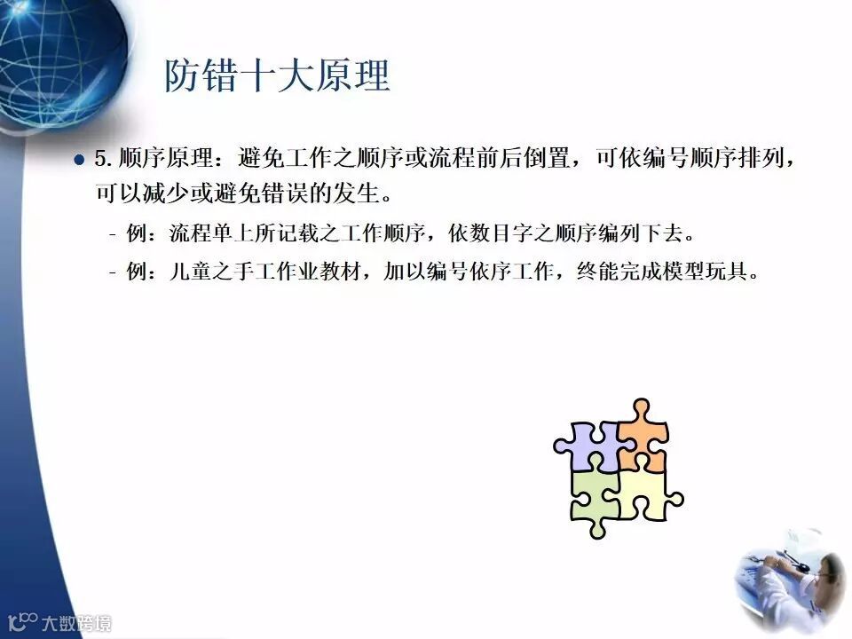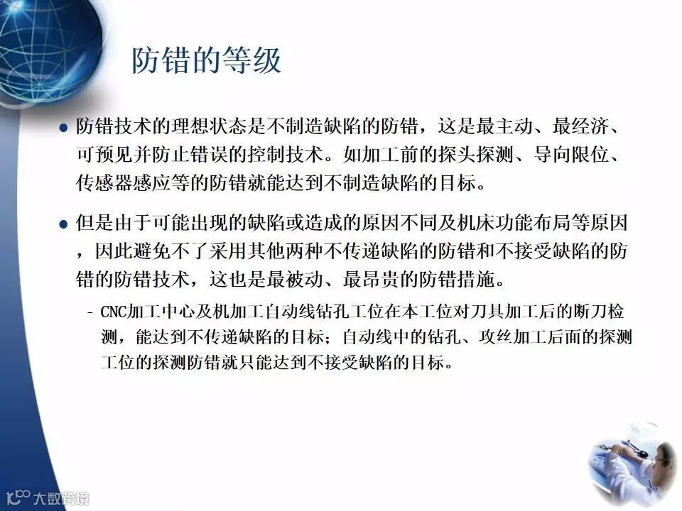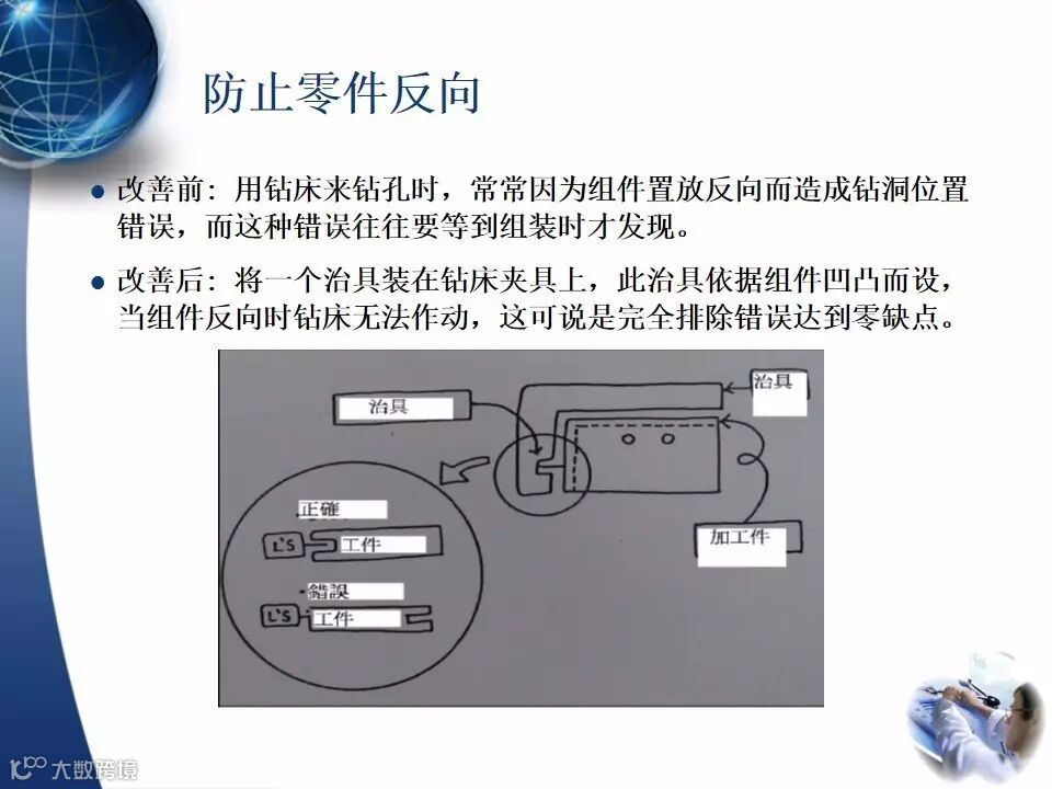 防错原理是通过究源性检查找出产生缺陷的根本原因,设计装置或方法对此差错实现100%检验,避免缺陷再次出现的方法。
