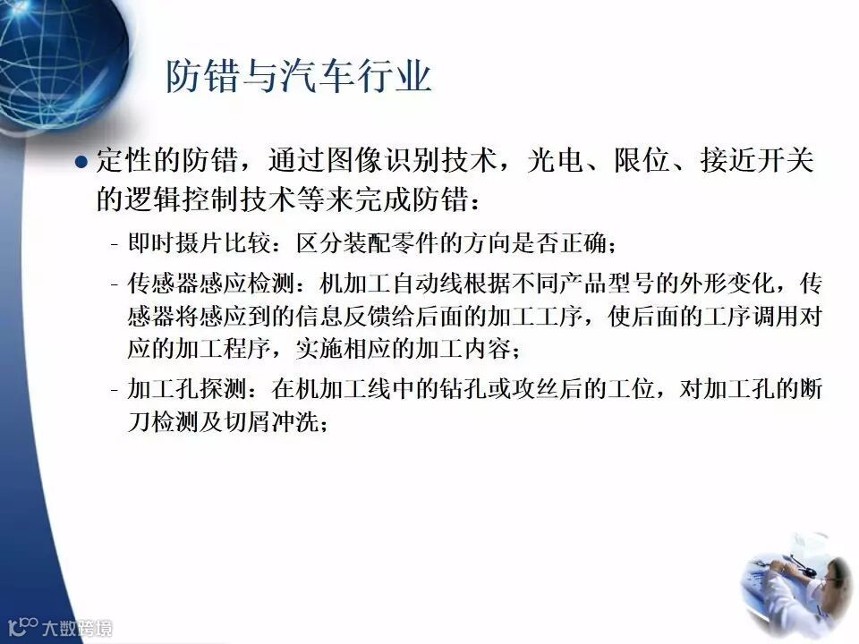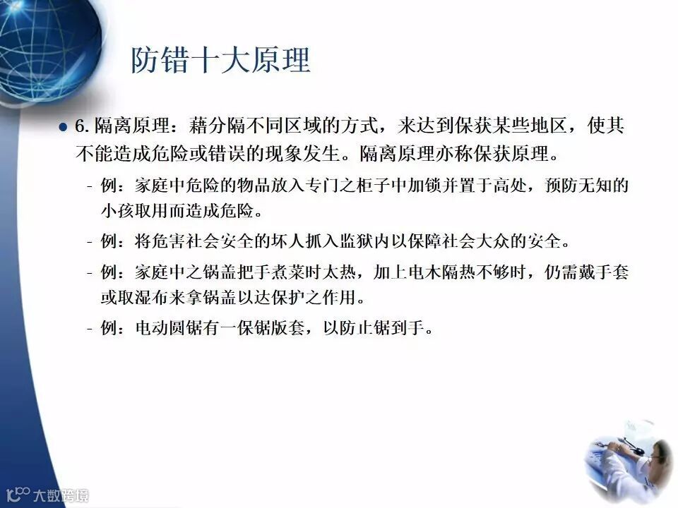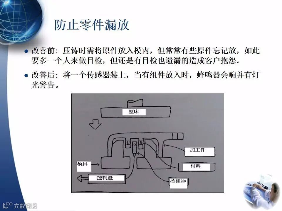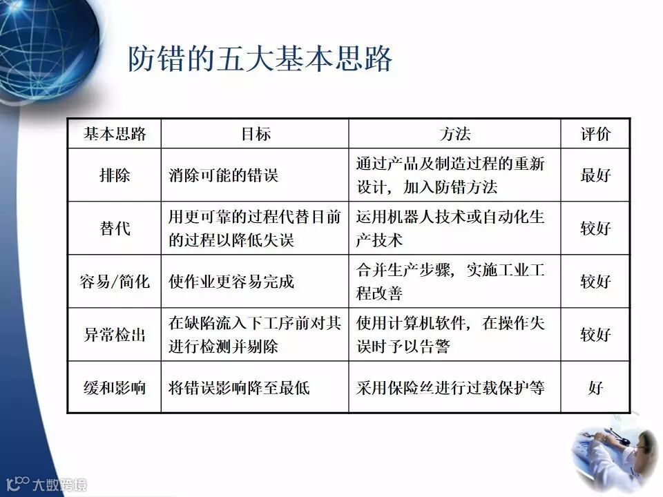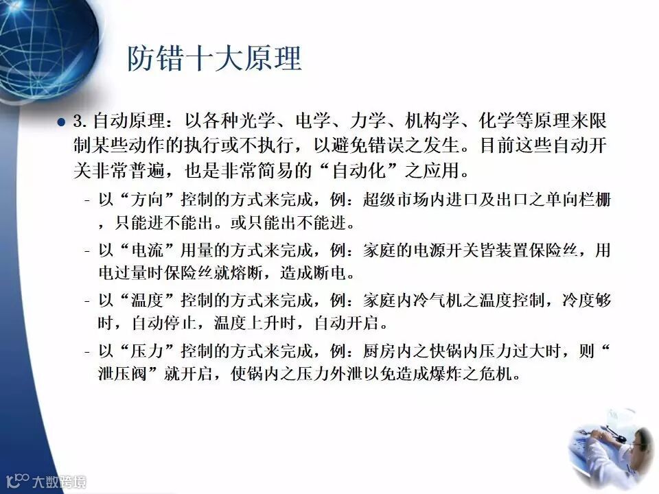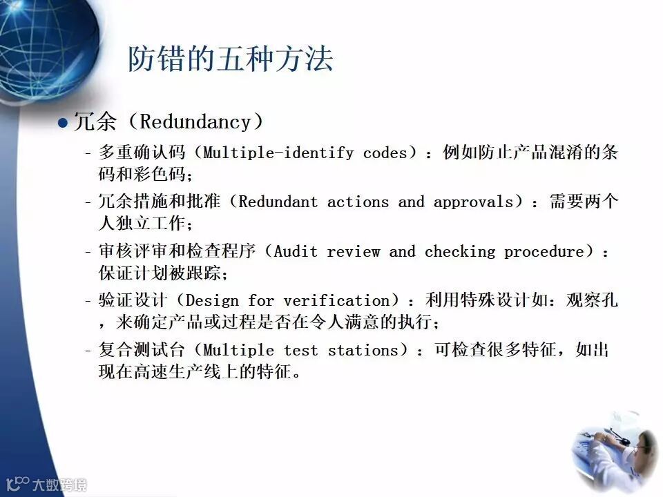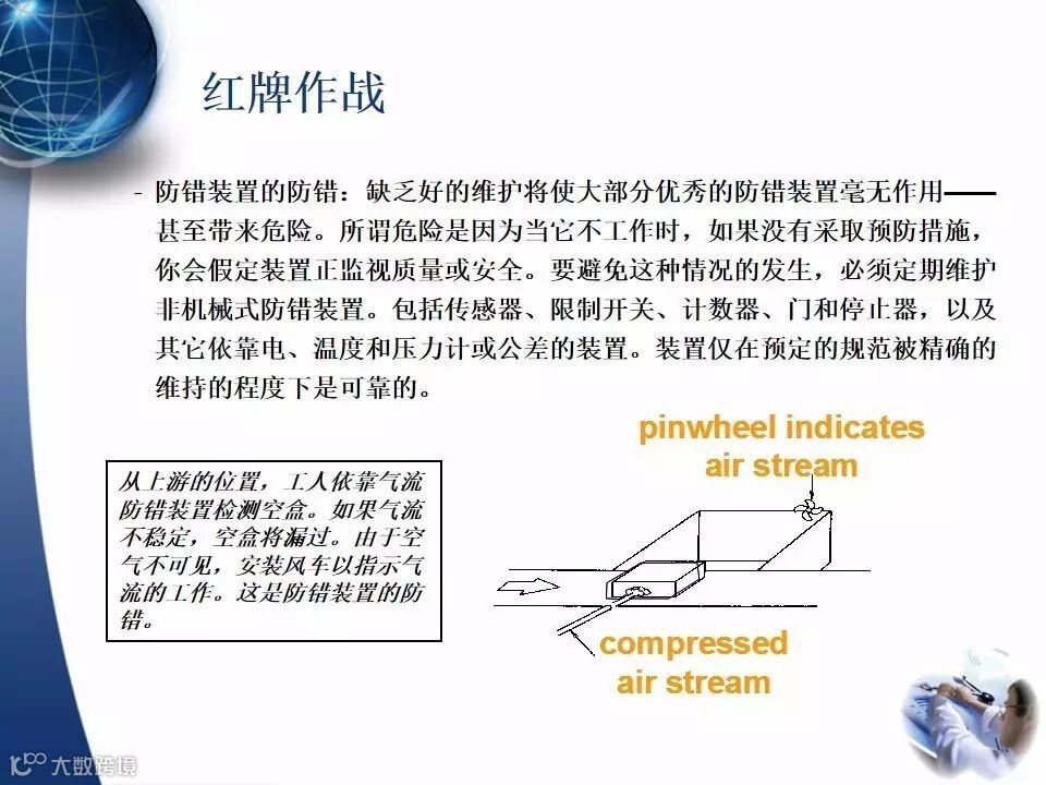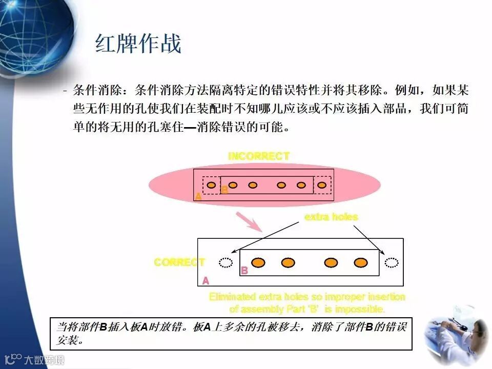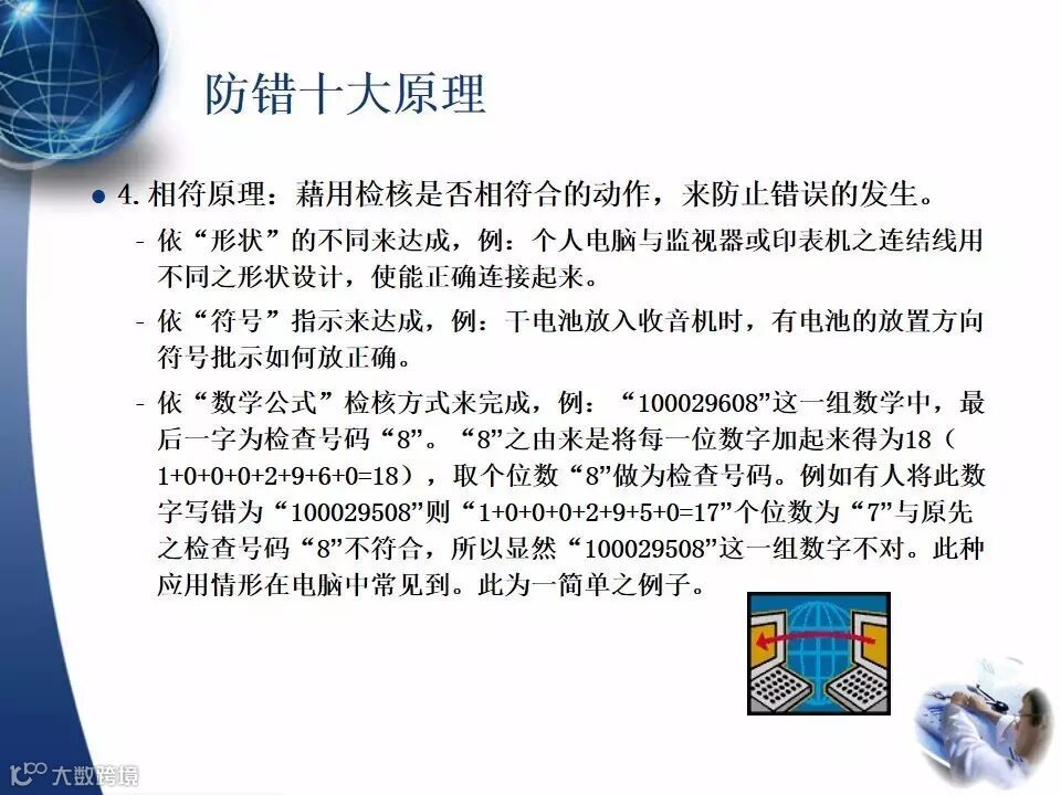 防错原理是通过究源性检查找出产生缺陷的根本原因,设计装置或方法对此差错实现100%检验,避免缺陷再次出现的方法。