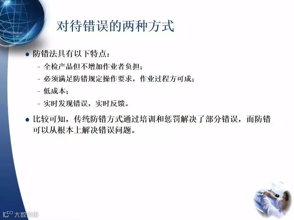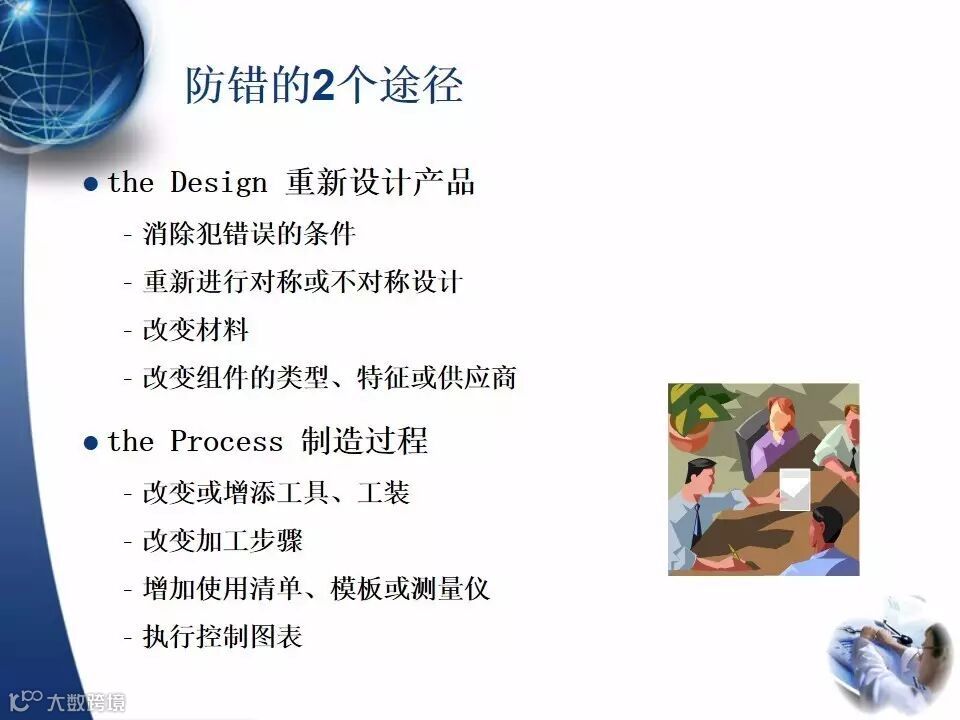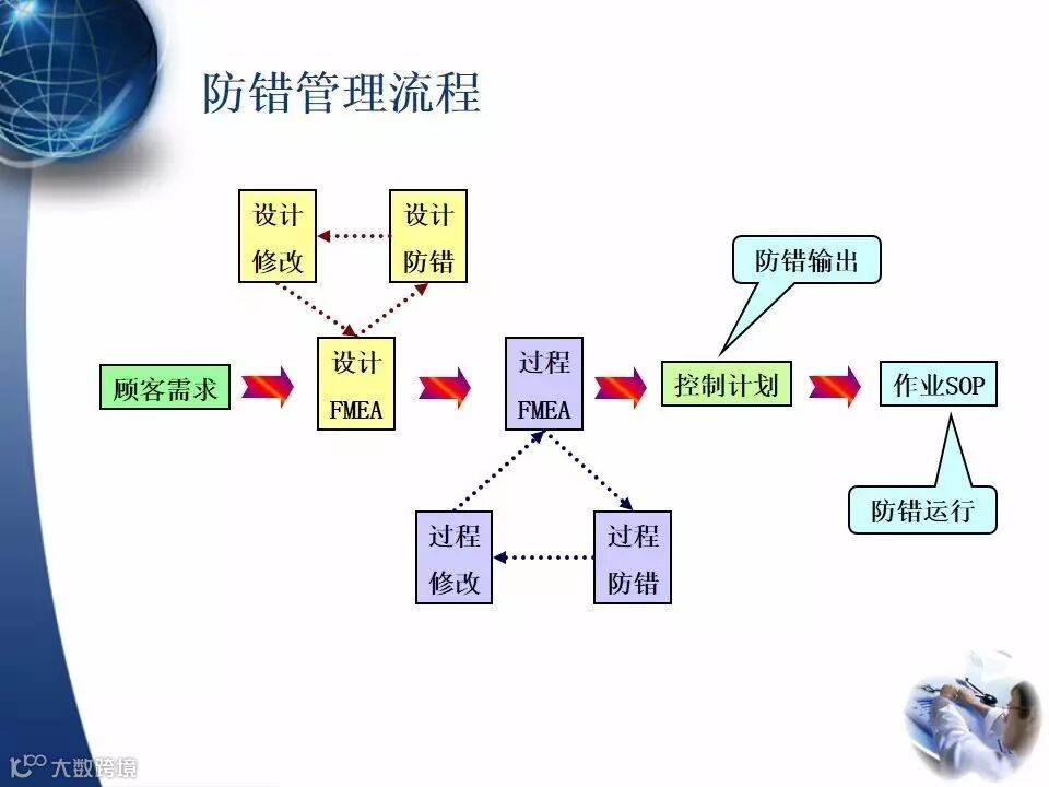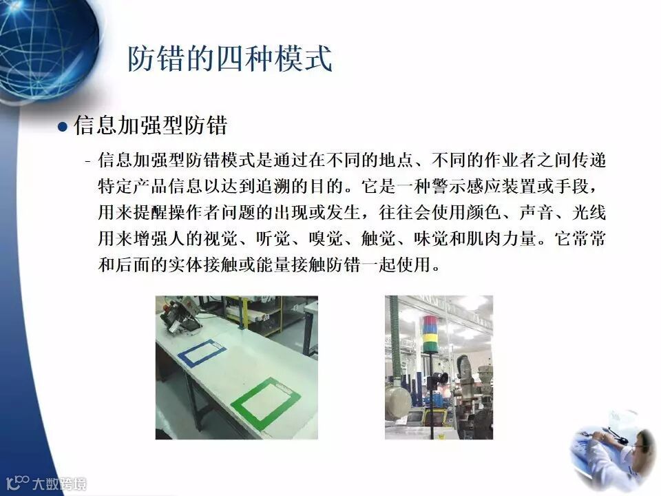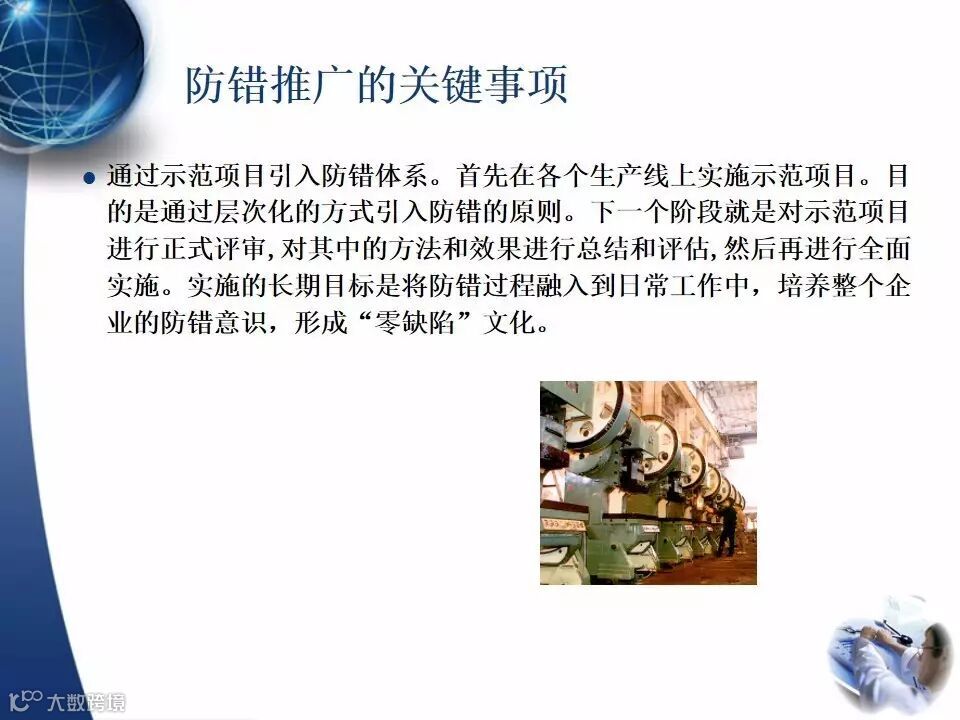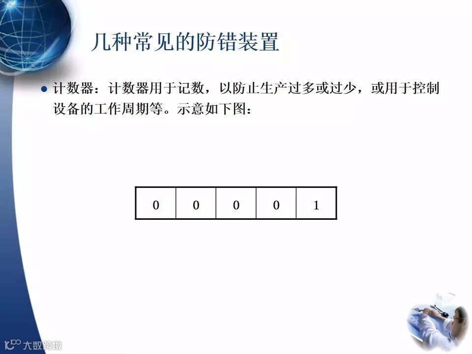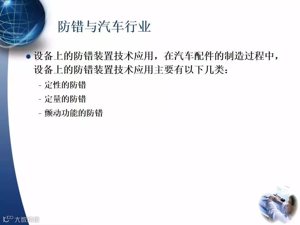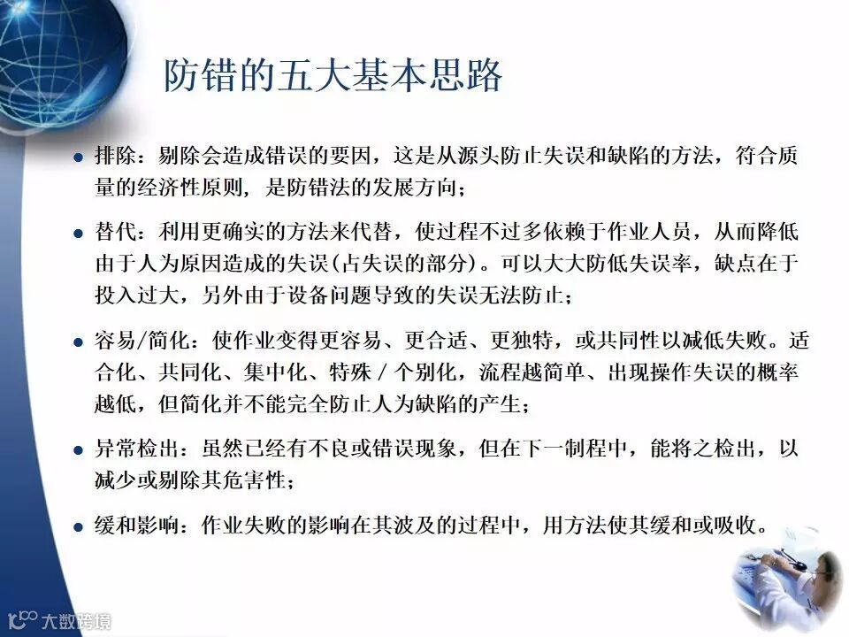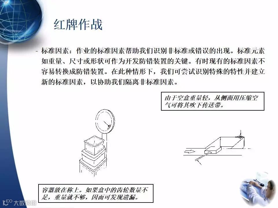防错原理是通过究源性检查找出产生缺陷的根本原因,设计装置或方法对此差错实现100%检验,避免缺陷再次出现的方法。