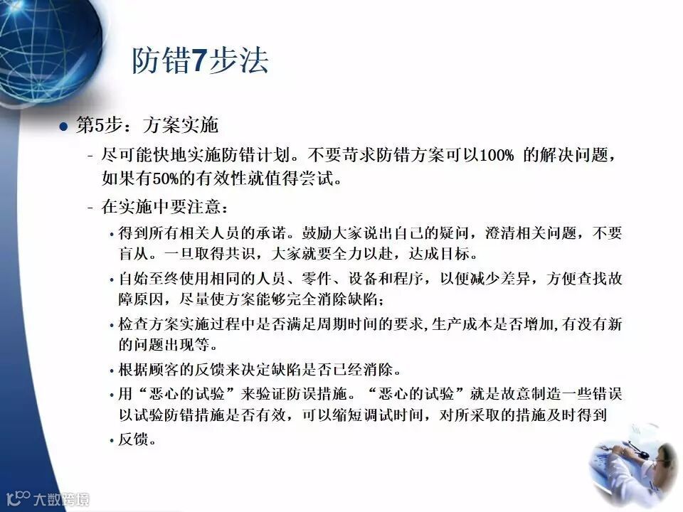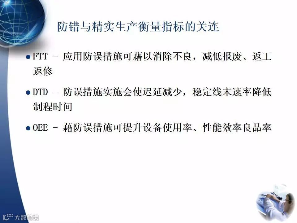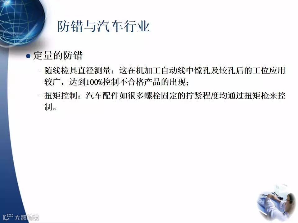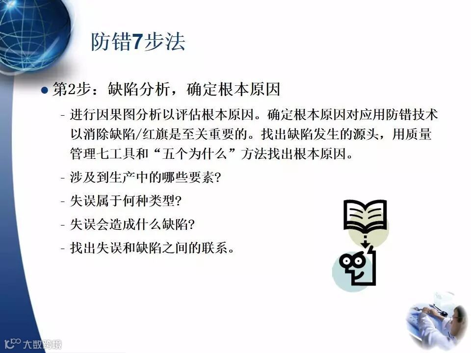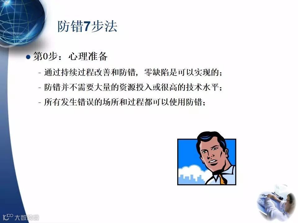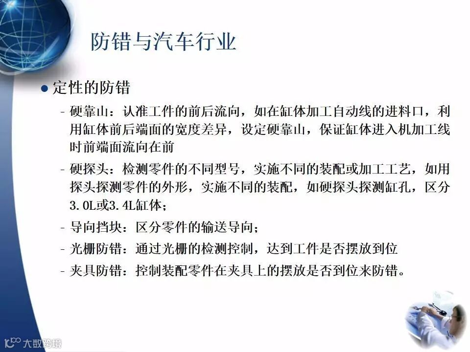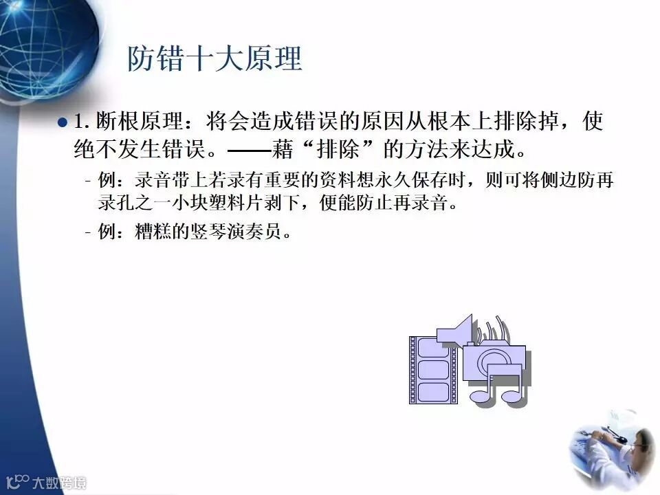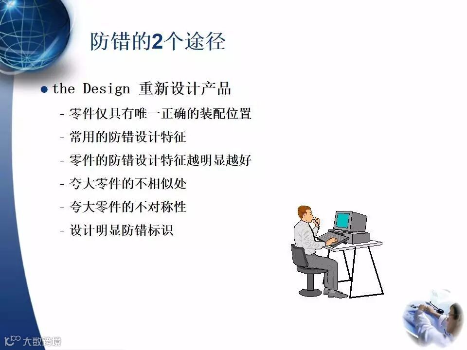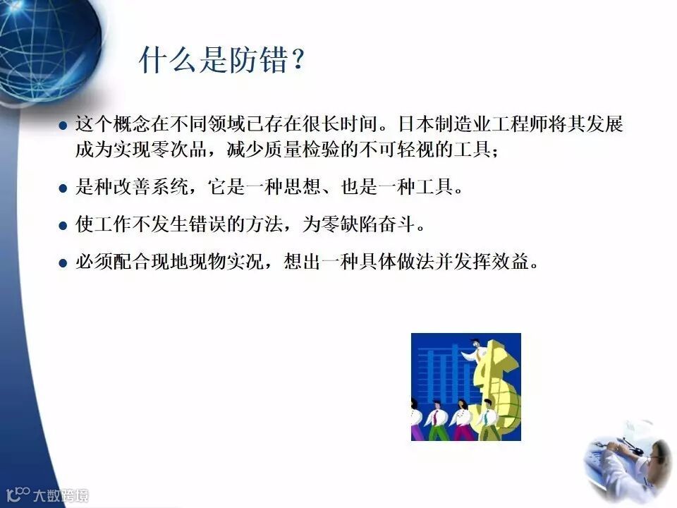 防错原理是通过究源性检查找出产生缺陷的根本原因,设计装置或方法对此差错实现100%检验,避免缺陷再次出现的方法。