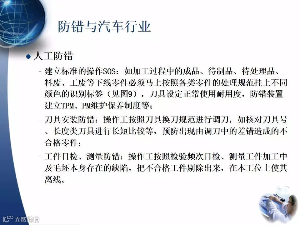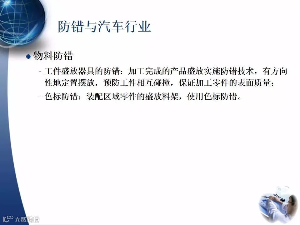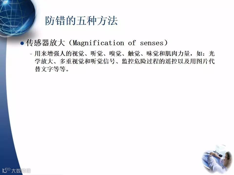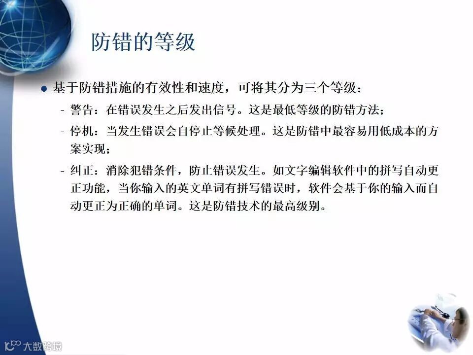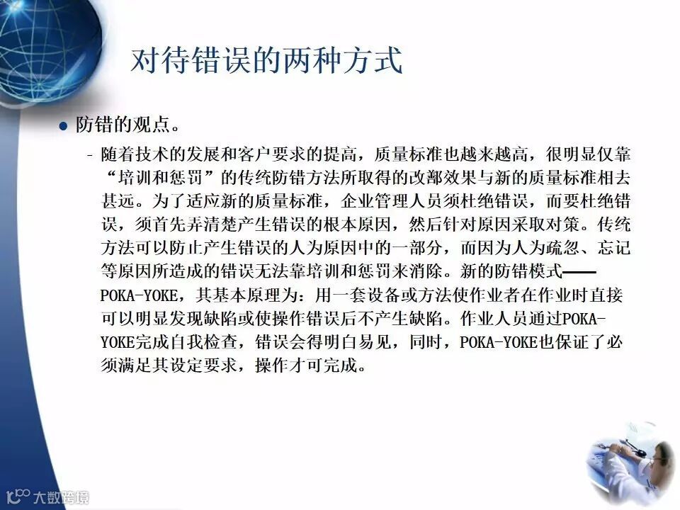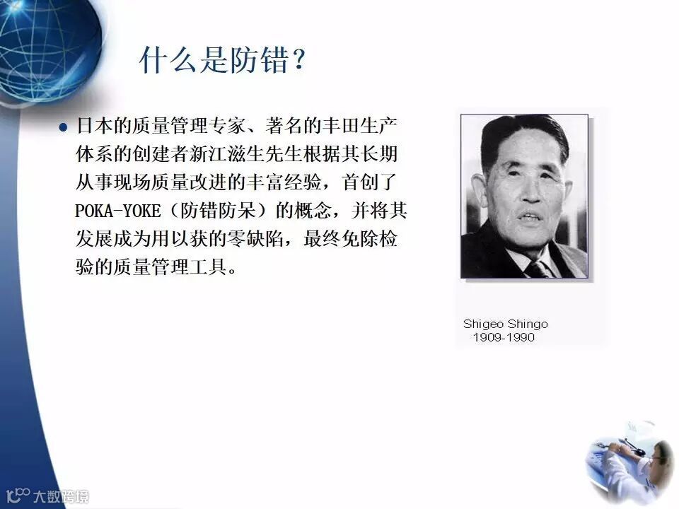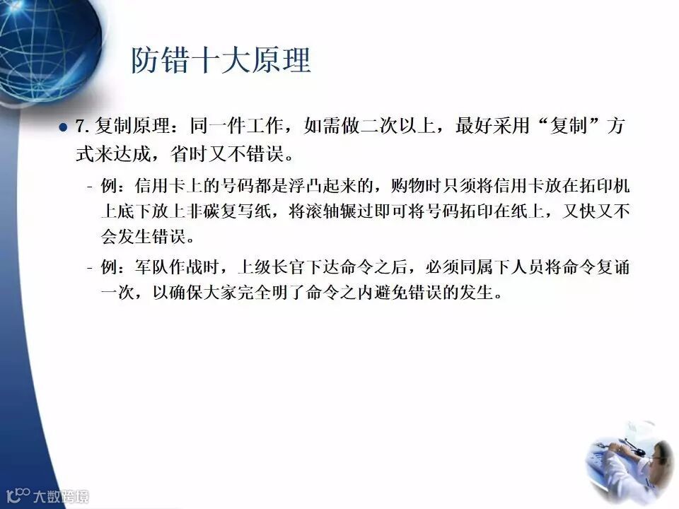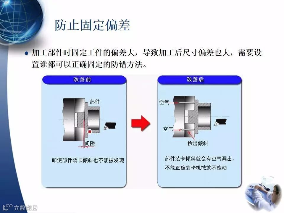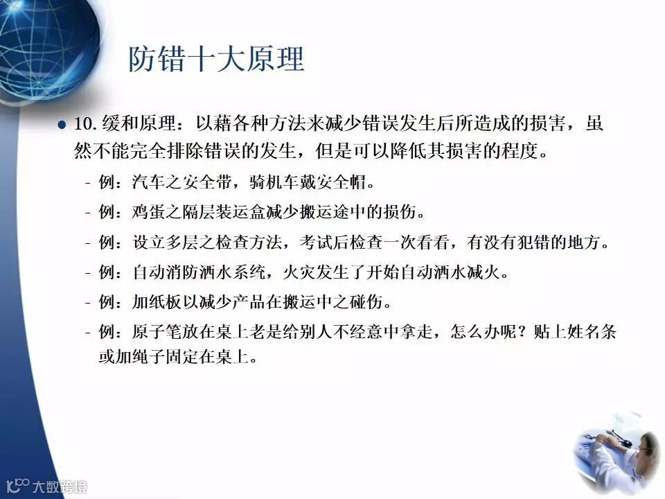 防错原理是通过究源性检查找出产生缺陷的根本原因,设计装置或方法对此差错实现100%检验,避免缺陷再次出现的方法。