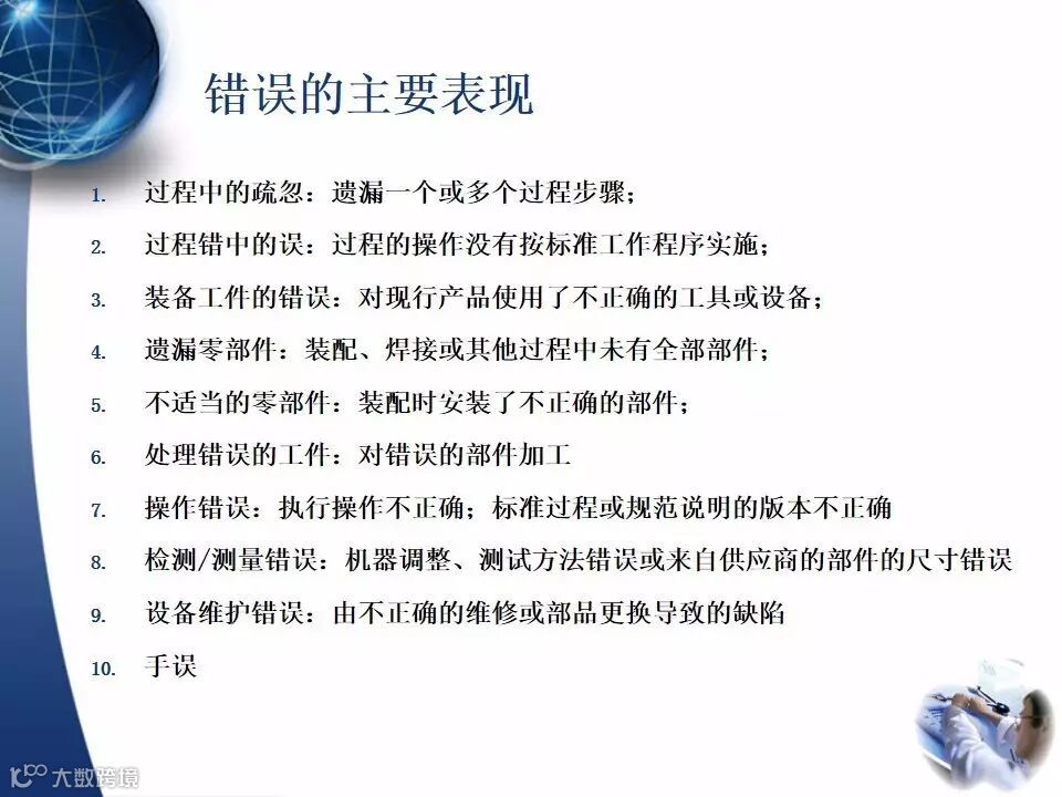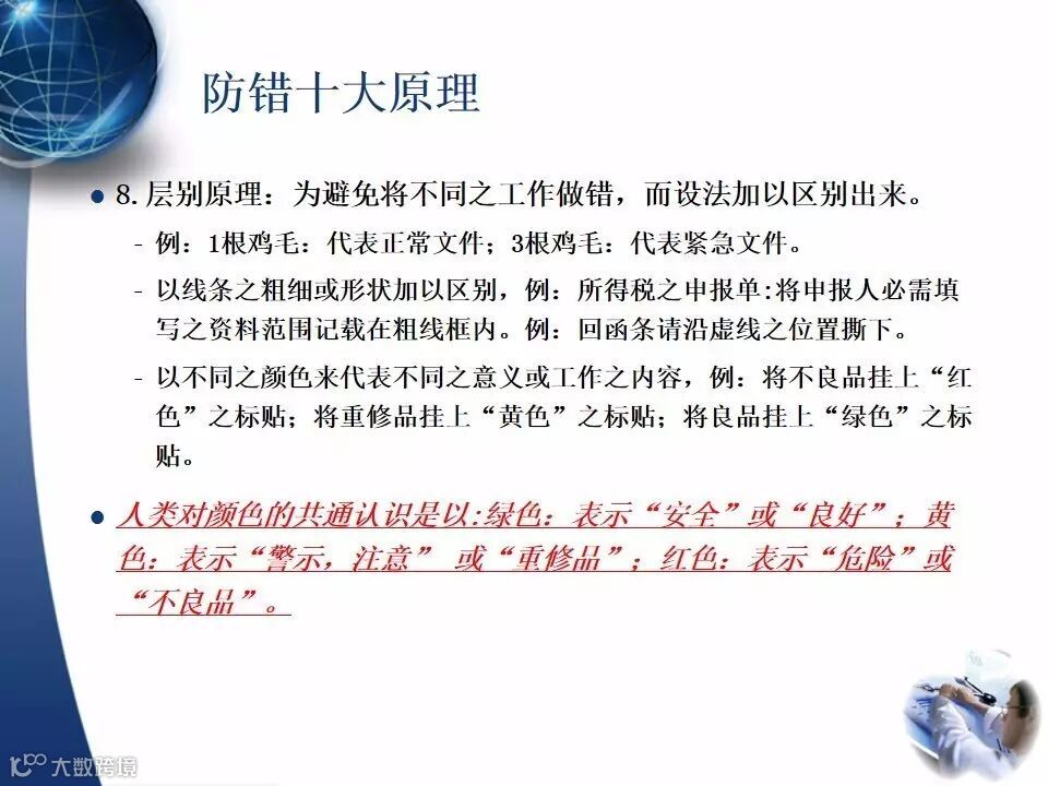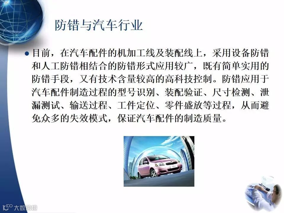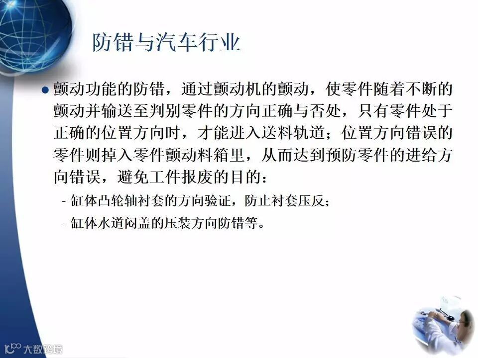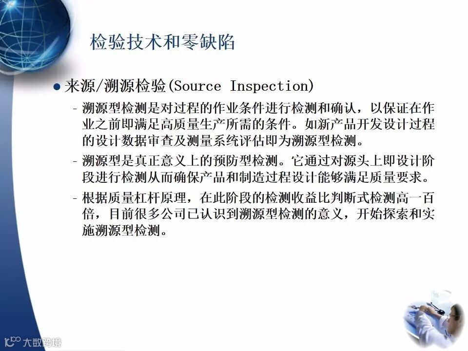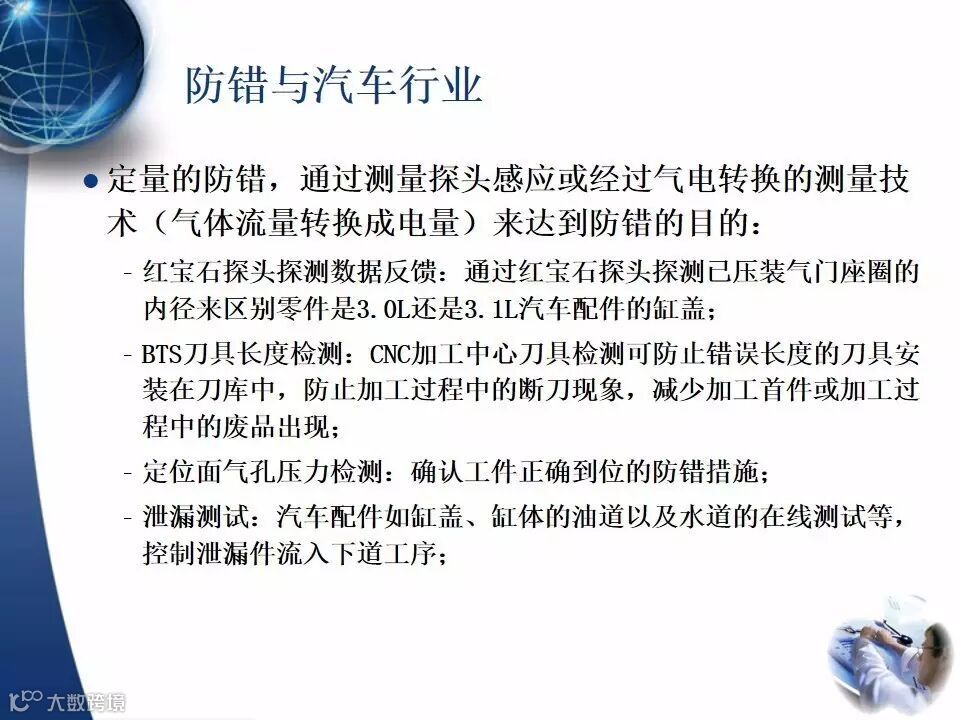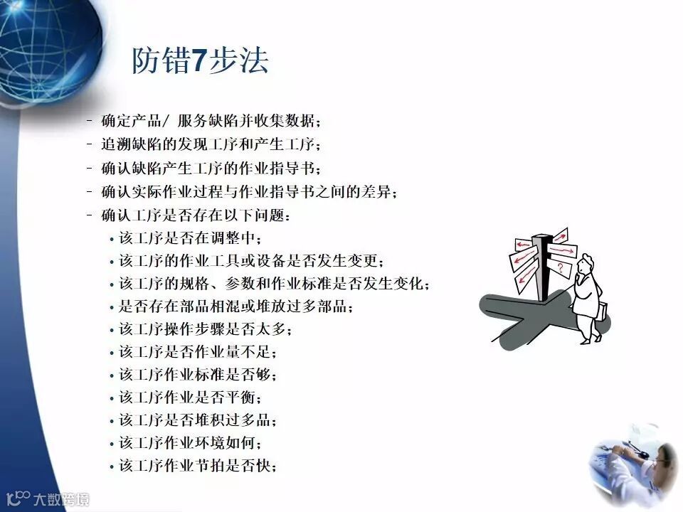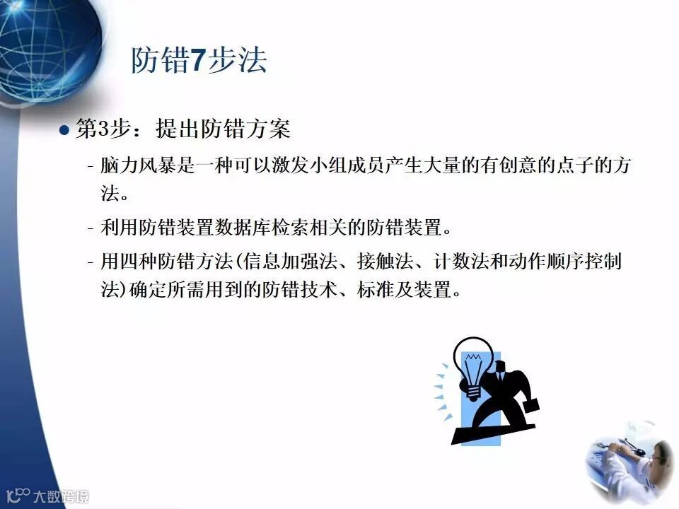 防错原理是通过究源性检查找出产生缺陷的根本原因,设计装置或方法对此差错实现100%检验,避免缺陷再次出现的方法。