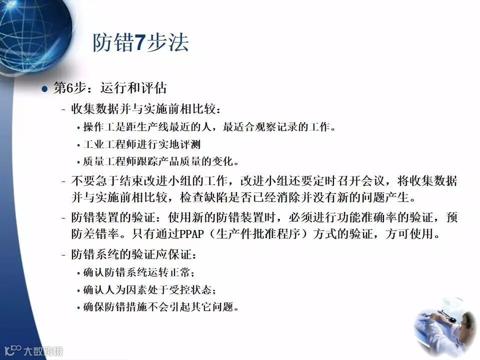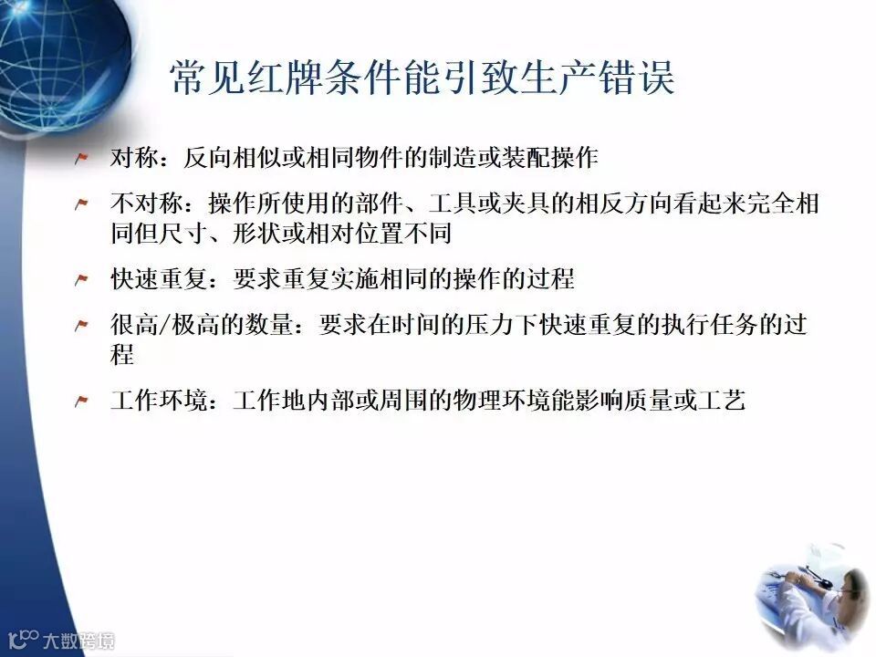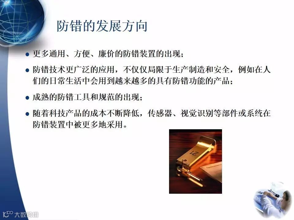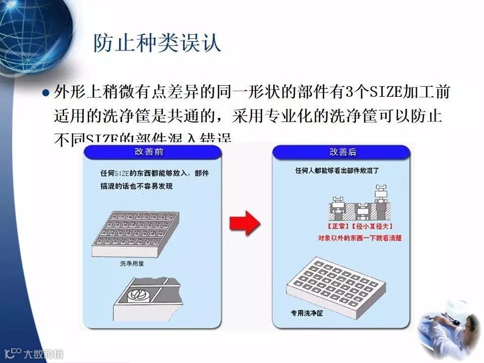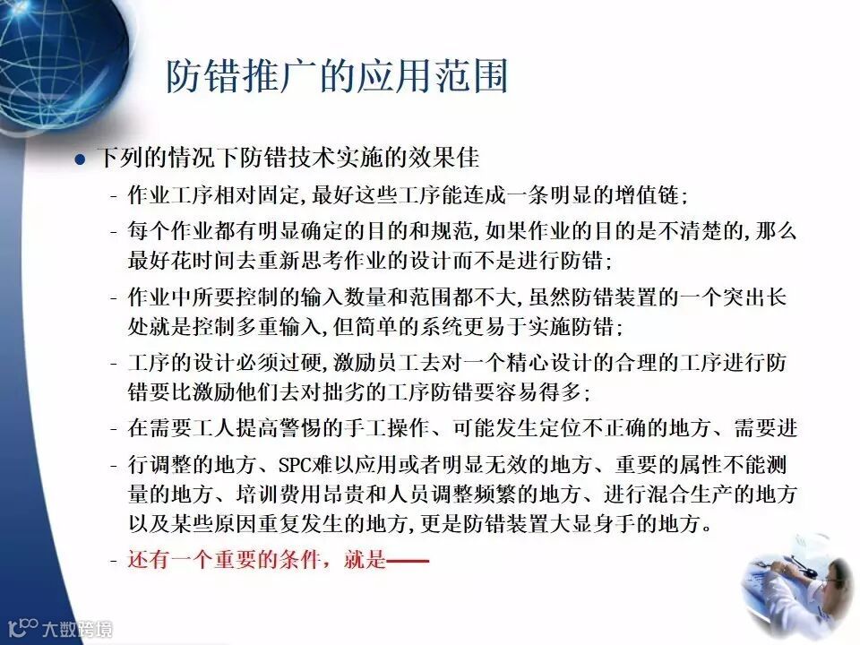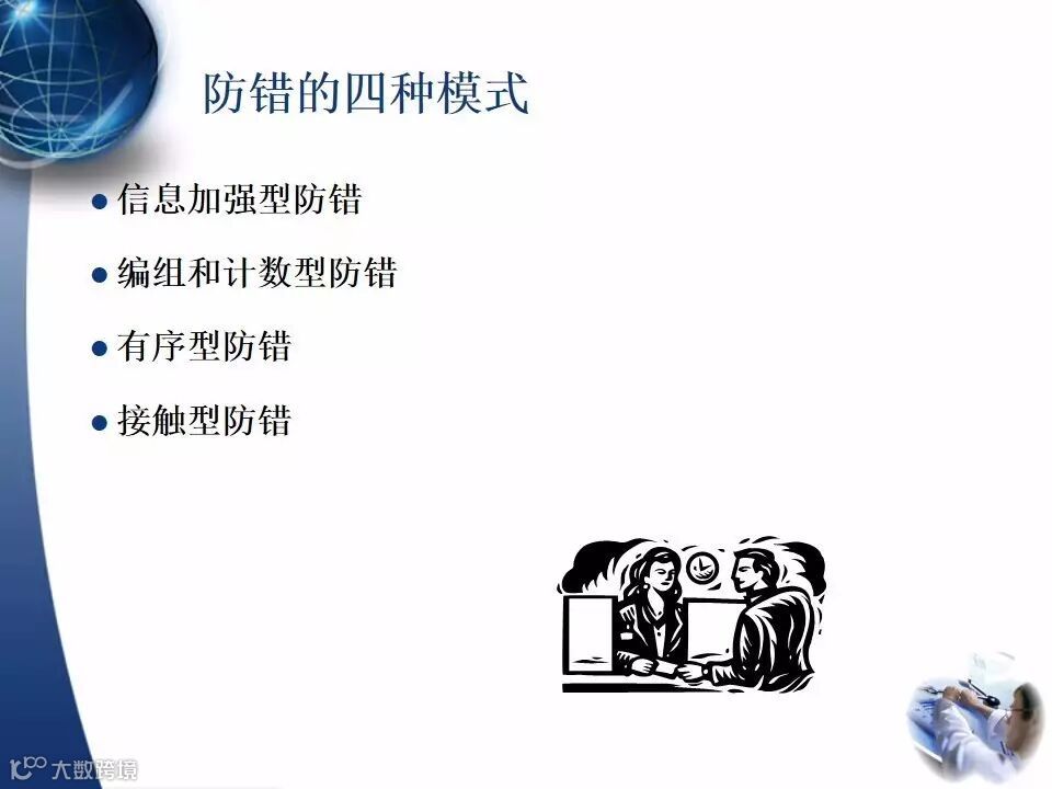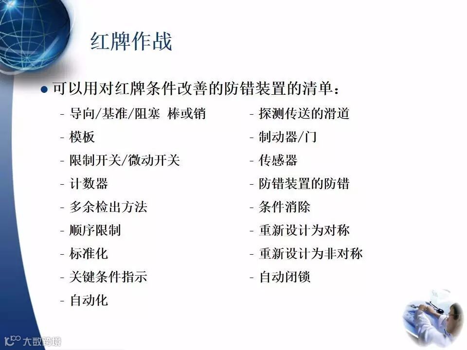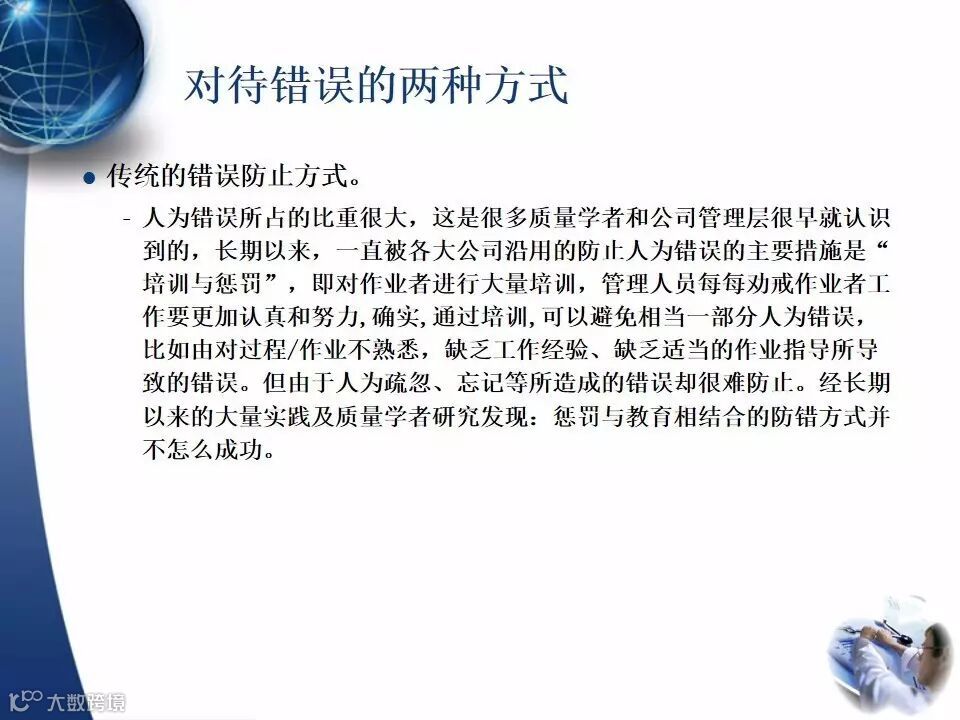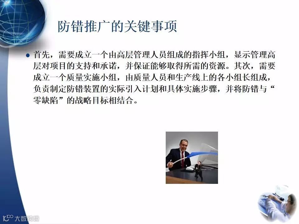 防错原理是通过究源性检查找出产生缺陷的根本原因,设计装置或方法对此差错实现100%检验,避免缺陷再次出现的方法。