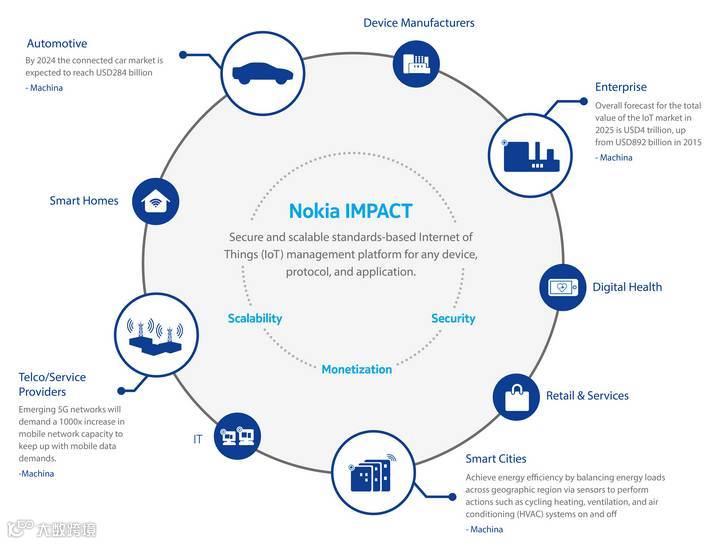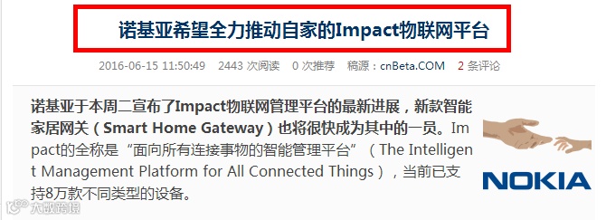 虽然日子挺好,但是毕竟在键盘手机时代有过霸主之名的辉煌,为了重拾往日荣光,诺基亚已经把目光瞄向了物联网,并且从15年下半年底布局不断。当时看诺基亚的一系列举动,只觉得雾里看花,但是在IMPACT横空出世后,才惊讶的发现:诺基亚这次是来真的!对于物联网,他早已成竹在胸!