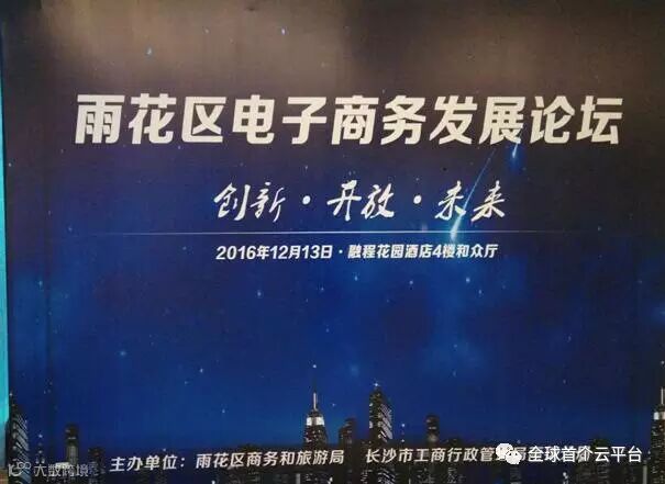 2016年12月13日由长沙市雨花区商务和旅游局、长沙市工商行政管理局雨花分局主办、湖南凌云电子商务有限公司“首个云平台”湖南省雨花区服务商公司——长沙见旺云电子科技有限公司协办的2016长沙市雨花区首届电子商务发展论坛于长沙融城花园酒店成功举办!此次论坛以“创新·开放·未来”为主题,邀请了120家电子商务企业负责人、省内电商、网商行业协会会员代表、省内科研院所、高校研究电商专家参加。