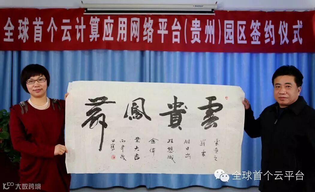 北京鴻蒙網科技有限公司董事長鄭世寶向貴州翔森投資置業有限公司董事長鄧媛贈送書法.