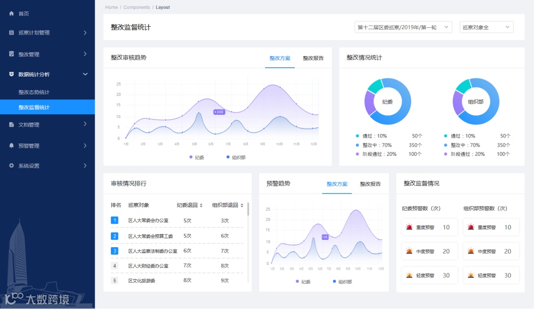 巡视巡察整改管理系统是强化巡视巡察上下联动,最大化实现整改工作成效的信息化管理系统。能有效破除巡视巡察整改工作中避重就轻、避实就虚、大事化小、小事化了等“形式主义”,以及整改不力、虚假整改等现象,使巡视巡察整改工作不打折扣、不走过场、不流于形式,最大化实现巡视巡察整改工作的严肃性、震慑力和效果。不断推动“两个责任”落到实处,全面从严治党向纵深发展。