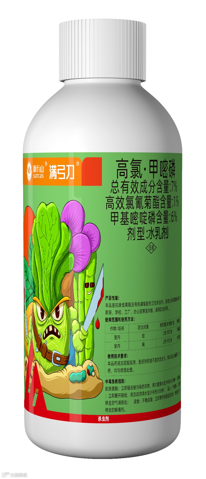 满弓刀为低毒有机磷和菊酯类农药复配,且制剂产品为低毒农药,6:1的含量复配对小虫毒力强,对较大虫口基数有压制效果,起到速效杀虫,渗透杀虫的效果。