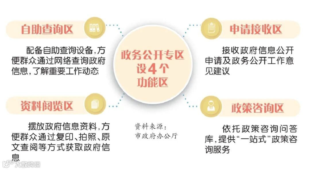 依托政务服务场所建设的政务公开专区分为自助查询区、资料阅览区、申请接收区、政策咨询区等4个功能区。
