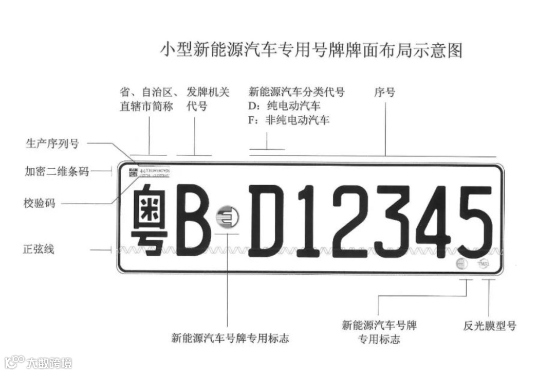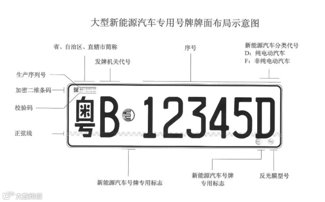 大型新能源汽车专用号牌的第六位先启用字母D、F(D代表纯电动新能源汽车,F代表非纯电动新能源汽车),前五位必须使用数字。