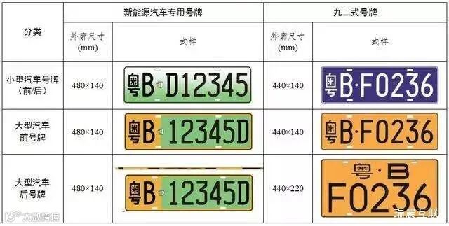 新能源汽车专用号牌与九二式号牌式样对比表。