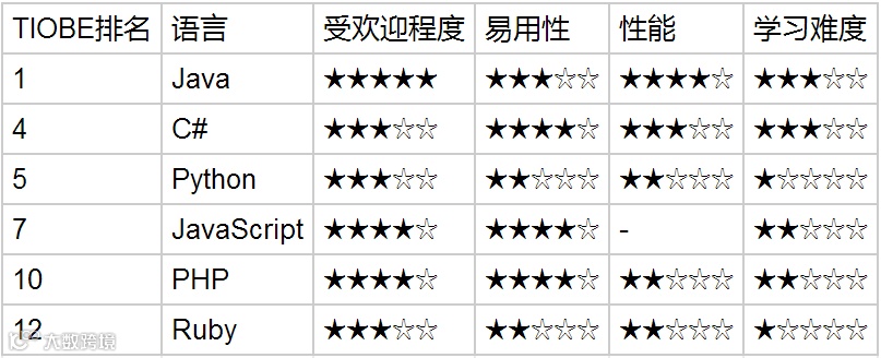 我们从2017年1月的TIOBE榜单中获得了最受欢迎的Top 20,再从中筛选出支持且相对擅长Web场景的语言,得到了接下去将参与评选的语言类型,支持后端开发的语言共6种:Java、C#、Python、PHP、Javascript、Ruby,iOS编程语言共2种:Objective-C、Swift。