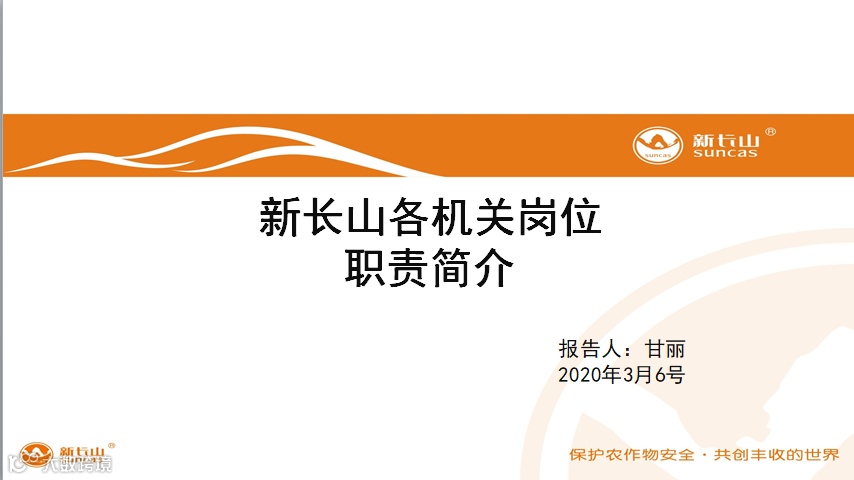 陈老师向大家展示市场部的最新岗位职责,现在市场部有选择性除草剂产品经理、柑橘作物产品经理、杀虫剂产品经理、种衣剂杀菌剂产品经理、品牌经理、设计经理等岗位,玉米,经作,小麦等产品经理还在招聘当中,基本涵盖公司的所有需求!随后陈老师介绍了市场部2020年的六大基本职能;2018-2022年市场部规划;2018-2022年新长山产品规划;2020年基础工作分配表等等。