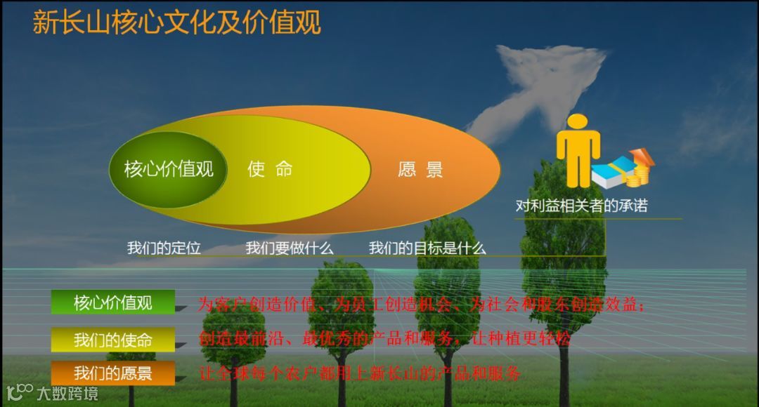 企业核心价值观:持续专注于农药板块,将农药做成终身事业,可传承的事业;核心价值观:为客户创造价值、为员工创造机会、为社会和股东创造效益;使命:新长山农学家,让种植更轻松;我们的愿景:让全球每个农户都用上新长山的产品和服务 。
