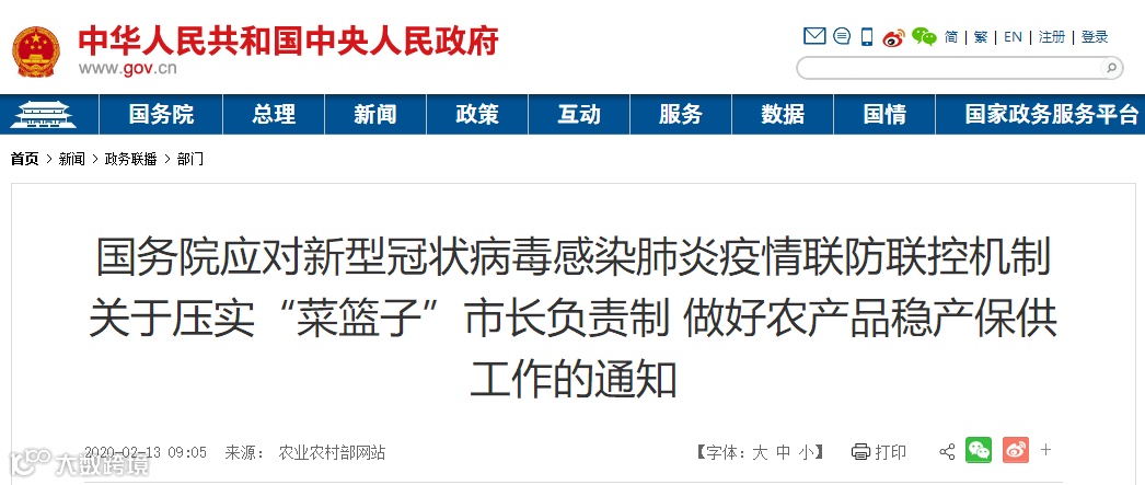 针对近期各地反映强烈的农产品运输、饲料运输、农资运输车辆受阻,导致农产品销售困难、养殖业难以为继,影响春耕用肥用药等问题,党中央、国务院高度重视,下发【国务院应对新型冠状病毒感染肺炎疫情联防联控机制关于压实“菜篮子”市长负责制 做好农产品稳产保供工作的通知】。