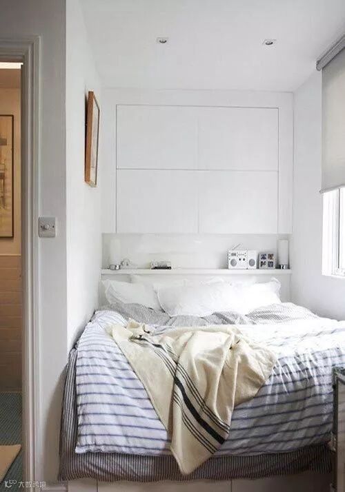 小到只能够放下一张双人床的空间里,以白色为主调是为了让整个卧室从视觉上来看有扩容的感觉,同时,将床头墙面的空间充分利用起来,做了两个大大的隐性收纳空间,平日里可以将一些季节替换的床品储存在这个地方。虽然这间卧室整体空间很小,但床边的小窗能够让这间屋子保持良好的通风,并且给予充足的阳光,这样的装修方式对于小户型来说也是不错的了。