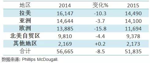 据Phillips McDougall初步统计,2015年全球植保销售额下降8.5%,至518.35亿美元。主要原因包括汇率变化,农化产品价格走低和多国库存较高,次要因素为草甘膦价格下降和气候多变等,如因厄尔尼诺现象造成的弱季风气候。去除汇率和通货膨胀因素,植保市场真正增长仅0.3%。若以现价美元计,销售额则下降了0.8%。
