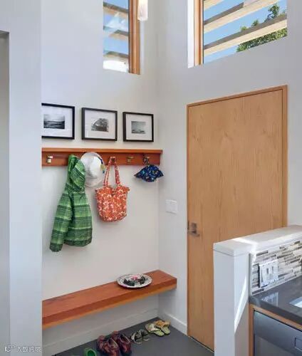 半墙的设计是用来分割玄关与其他区域空间,对立面则建议木条凳充当座椅,日常换鞋更为方便。墙面挂钩是对立面空间最简单易行的利用法则,谁都可以办到!