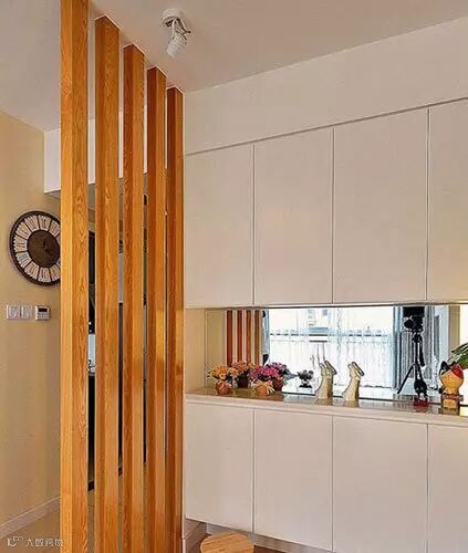 为避免客人一进门就对整个室内一览无遗,在进门处用木制或玻璃作隔断,划出一块区域,在视觉上遮挡一下。