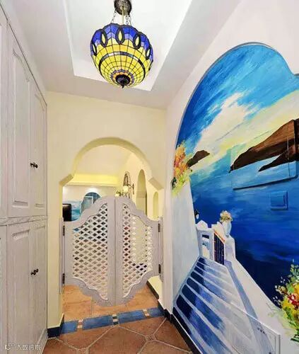 地中海式的玄关,中间有镂空复古木门来跟其他室内空间做个简易分隔,有种中式的移步换景的视觉效果。地中海特有的元素在小玄关里堆积爆炸,瓷砖的颜色和花纹,实木的风干外观,墙面的应景手绘,推开门,就能感受到浓郁的地中海分味道。