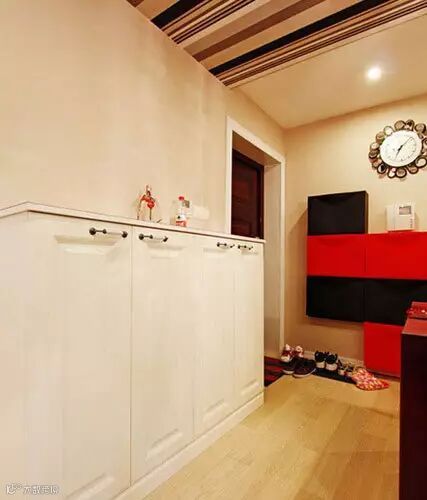 推开门,就是长长的玄关,直线条的空间让玄关打造中规中矩。宜家风的黑红相间的鞋柜占据玄关最里端的墙面空间,让家里的鞋子都有一个安身之所。
