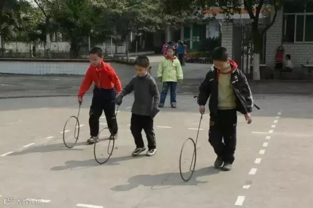 滚铁环是放假休息的娱乐项目,跑得气喘吁吁的也停不下来。不过这已经失传了,没人玩了!