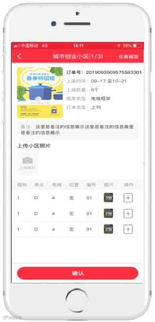 系统派单后,数据传递至“易上刊”平台,上刊人员查看接收到的小区订单详情,根据区域单独选择或批量选择小区进行订单确认,收货。