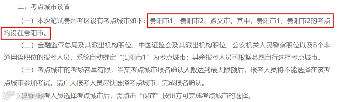 金融监管总局及其派出机构职位、中国证监会及其派出机构职位、公安机关人民警察职位以及8个非通用语职位的报考人员,系统自动绑定“贵阳市1”为考点城市;其余报考人员可根据意愿自行选择考点城市。