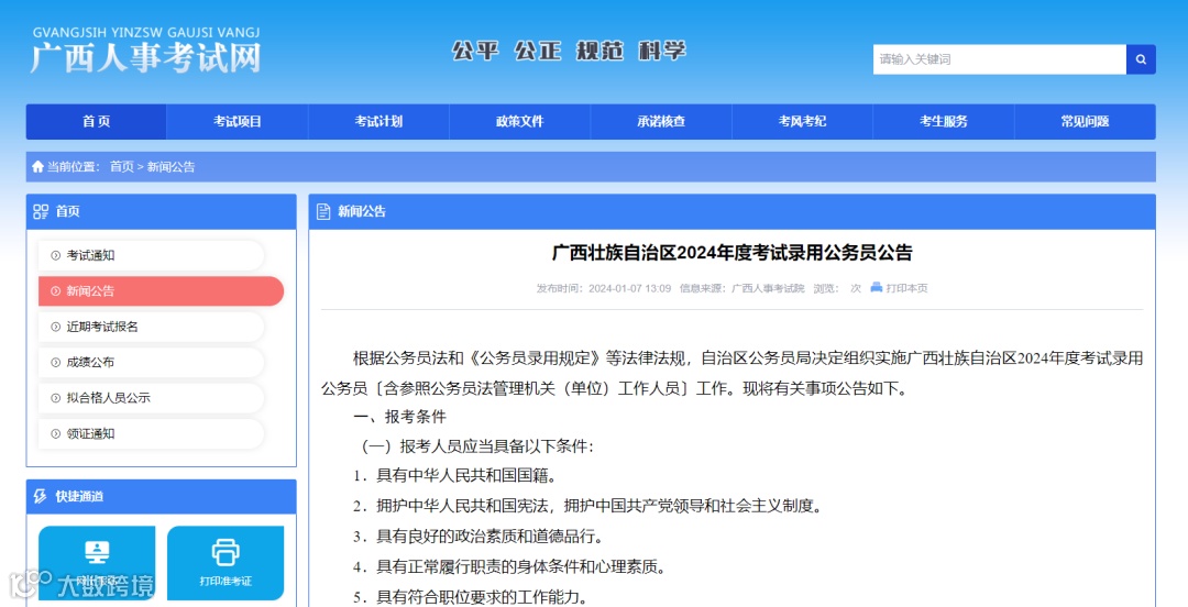 广西2024年度考试录用公务员公告