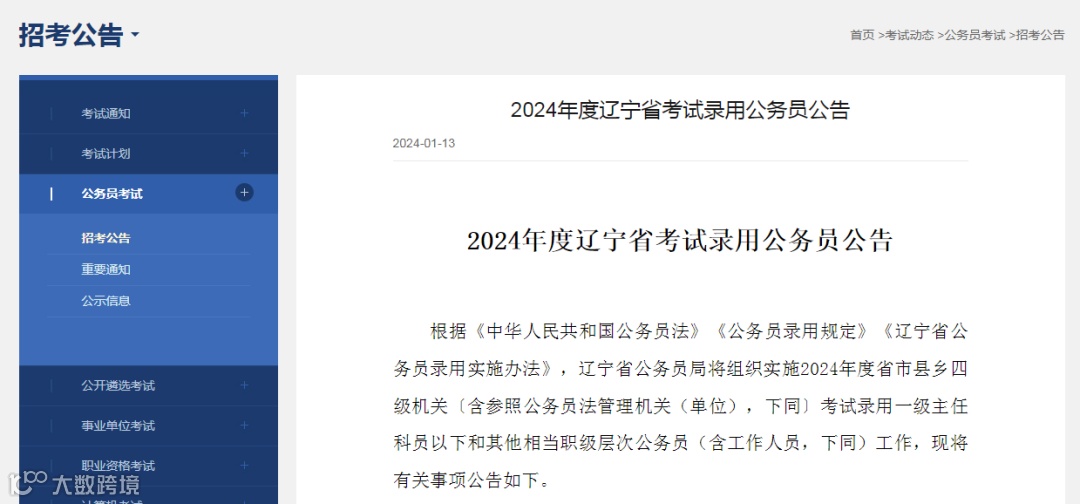 辽宁省2024年度考试录用公务员公告