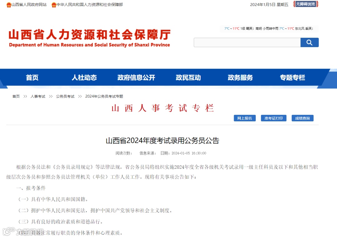山西省2024年度考试录用公务员公告