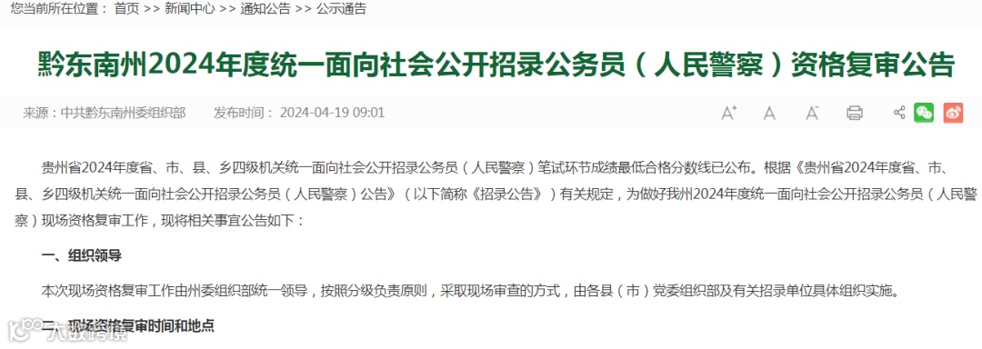 1.黔东南州2024年度统一面向社会公开招录公务员(人民警察)的面试工作拟于2024年5月11日、12日进行(具体时间以我州发布的面试公告为准),我州发布的各环节招录信息,如面试、体能测评、体检等相关事宜内容都将在“黔东南州人民政府网(http://www.qdn.gov.cn/)”进行公布,进入资格复审的报考人员须及时关注相关公告,并保持通讯畅通,如因未阅读公告或错填联系电话、关闭电话、更换电话号码等导致无法联系上而未参加资格复审的,其后果由资格复审对象本人承担。同时,我州各级公务员主管部门不举办也不委托任何机构举办任何形式的面试培训班、辅导班,请广大考生提高警惕,莫被误导干扰,谨防上当受骗,共同维护良好的公务员考试秩序。