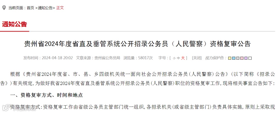 根据《贵州省2024年度省、市、县、乡四级机关统一面向社会公开招录公务员(人民警察)公告》(以下简称《招录公告》)有关规定,为做好我省2024年度省直及垂管系统公开招录公务员(人民警察)职位的资格复审工作,现将相关事宜公告如下: