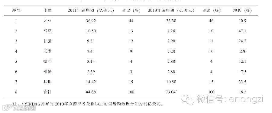 近年来,巴西的杀虫剂超过除草剂成为巴西销售额最大的农药类别。巴西销售量最大的农药类别是除草剂;种植制度变革导致杀菌剂的销售额增长缓慢;杀菌剂的使用作物主要是大豆、咖啡、棉花、柑橘、马铃薯和豆类。 其中销售增长的有棉花、小麦、咖啡和大豆! 销售下降的有豆类、土豆、西红柿和水果、杀菌剂增长缓慢的原因:一是种植制度变革有效缓解了亚洲大豆锈病,如收获和春季播种时间间隔90天的措施! 农民的接受程度大大提高! 大豆杀菌剂的使用量将相对下降! 预计这一趋势未来将保持几年。二是美国加强橙汁产品多菌灵残留的管理! 导致杀菌剂多菌灵的使用量急速下降.大豆是使用农药最多的作物.