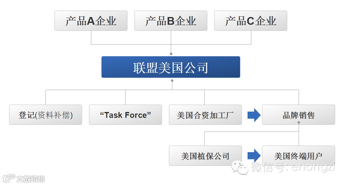 以“联盟”美国公司(CASA USA)的名义与当地的农药加工企业和植保服务企业成立独资或合资的农药加工厂,把中国产的农药原药(制剂)加工(分装)成美国产的农药制剂产品(end use product)进一步销售给美国的植保公司和终端用户。